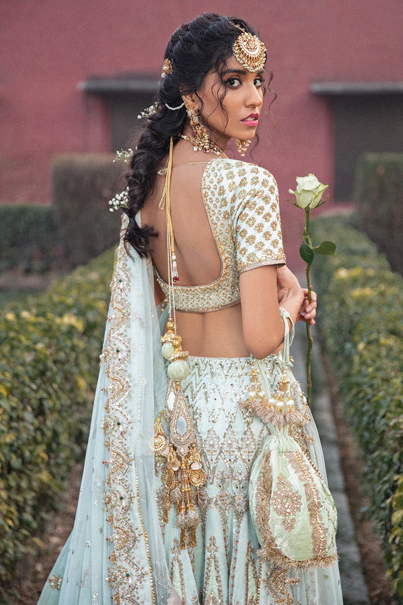 The choli is crafted from refined Indian silk in a soft mint hue. Its clean silhouette allows the craftsmanship to shine, offering a graceful and balanced foundation for the ensemble.