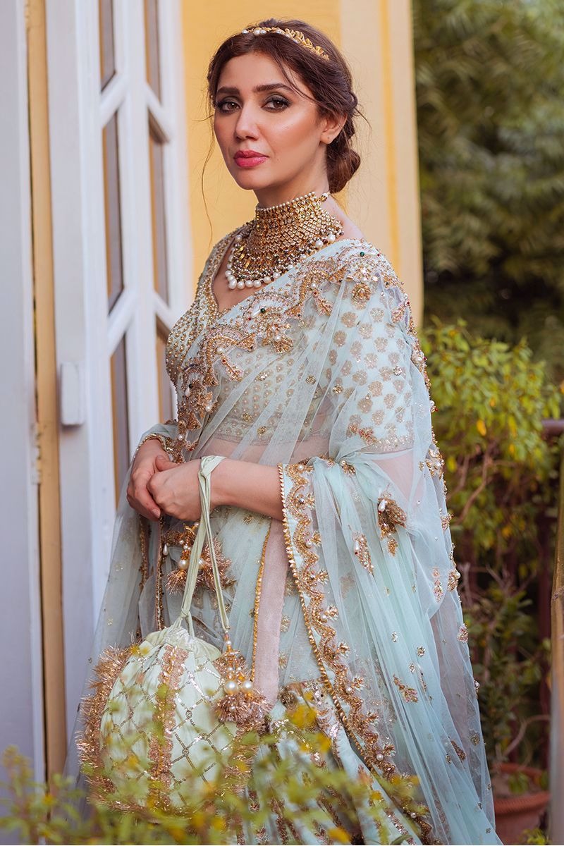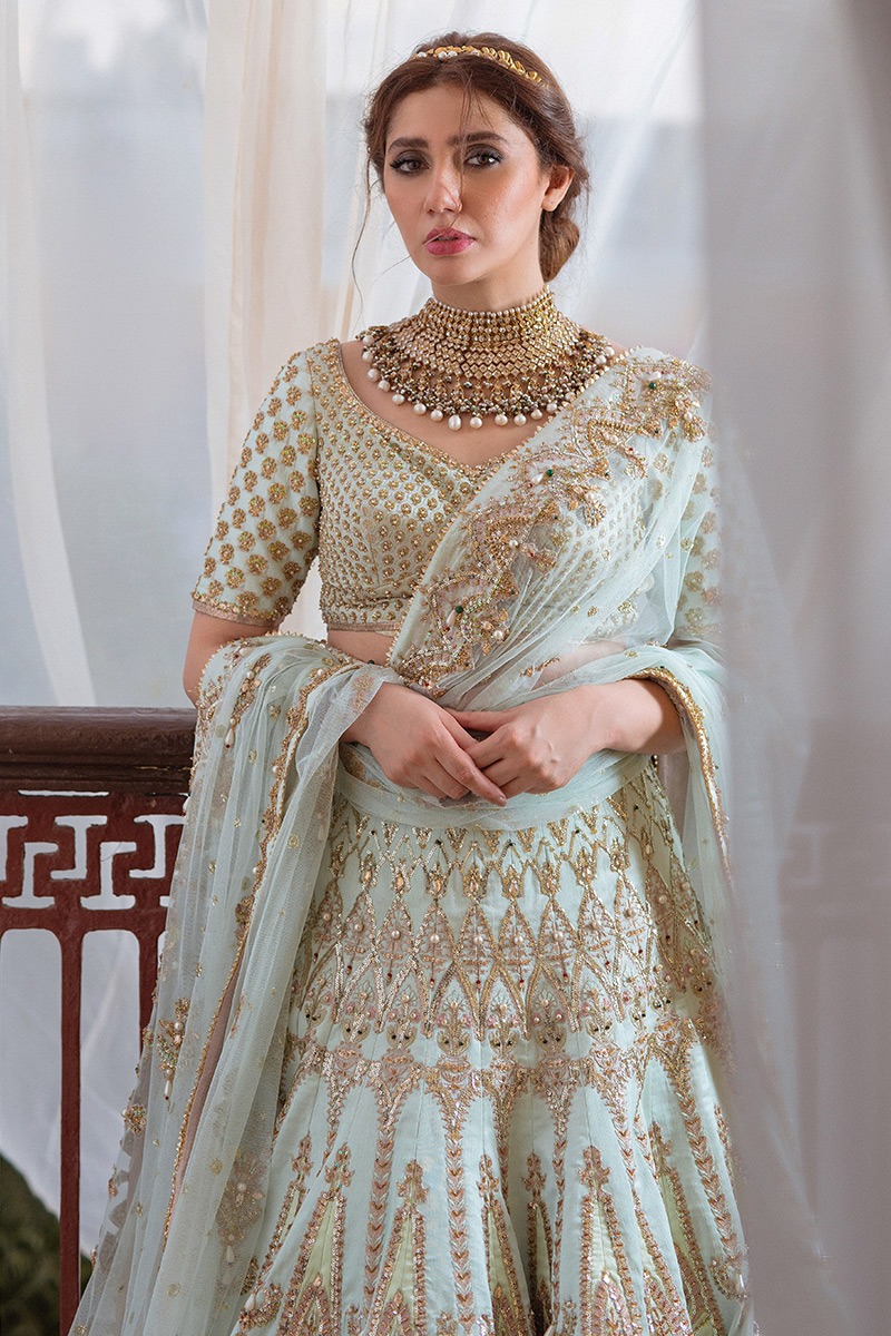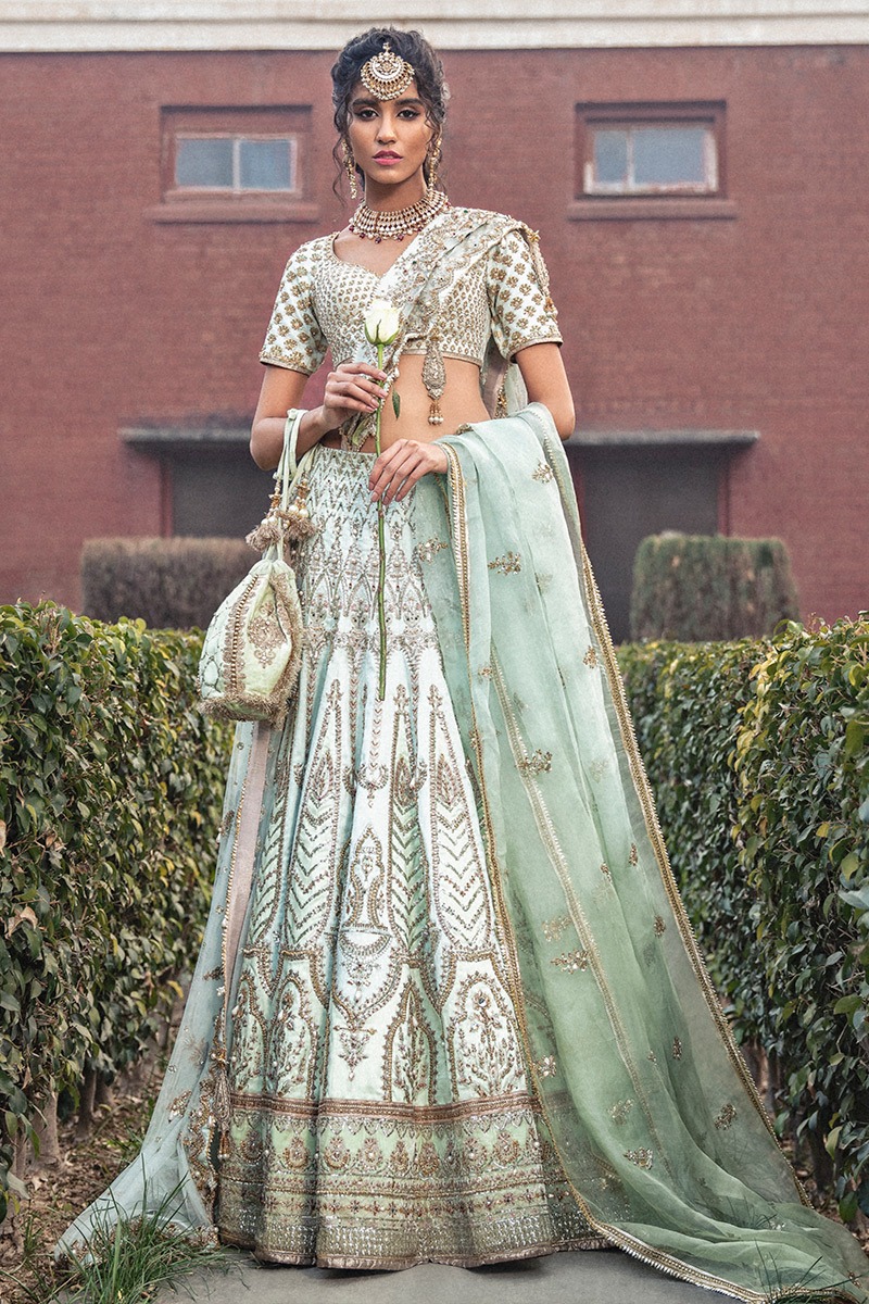 A luminous five-piece bridal ensemble in refreshing mint tones, blending airy silk textures, delicate hand embellishment, and layered dupattas for an effortlessly elegant bridal look.
