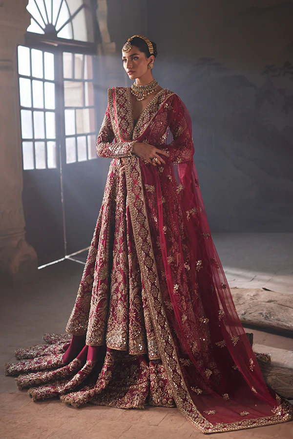 An ode to classic bridal elegance, Zohra blends intricate hand craftsmanship with a graceful silhouette, featuring a statement farshi lehnga and a delicately adorned net dupatta for an unforgettable ceremonial look.
