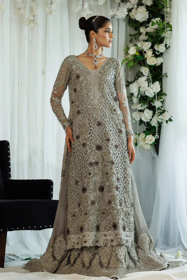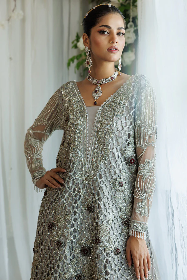Heavy cutwork detailing paired with stones, qora dabka, and delicate motifs arranged to enhance the outfit’s luxurious aura. The dupatta features fine purl chan embellishment for a balanced, elegant finish.