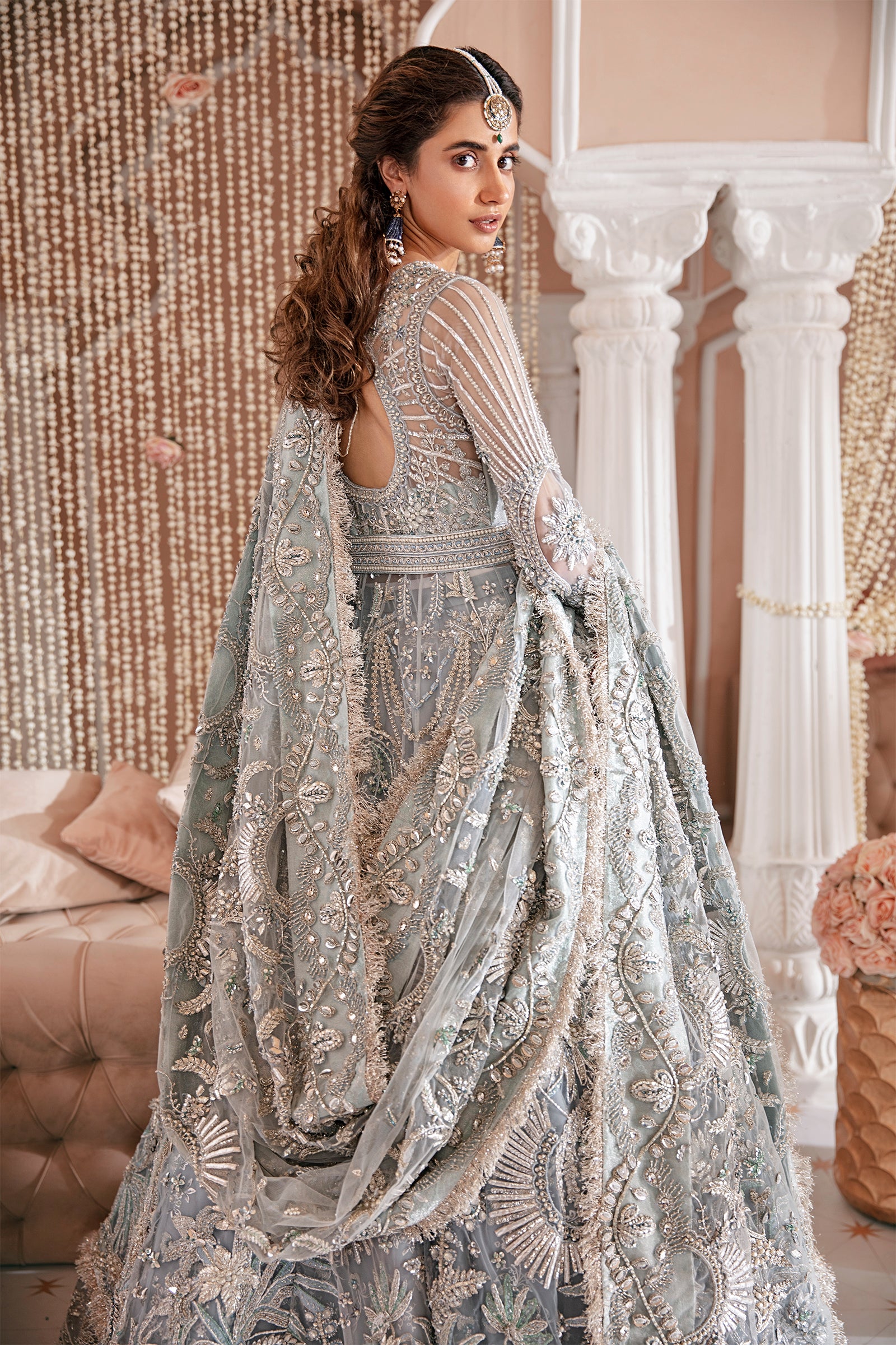 An exquisite all-silver couture ensemble designed to dazzle, featuring intricate zardozi, crystal embellishment, and shimmering layers that transform every occasion into a celestial celebration.