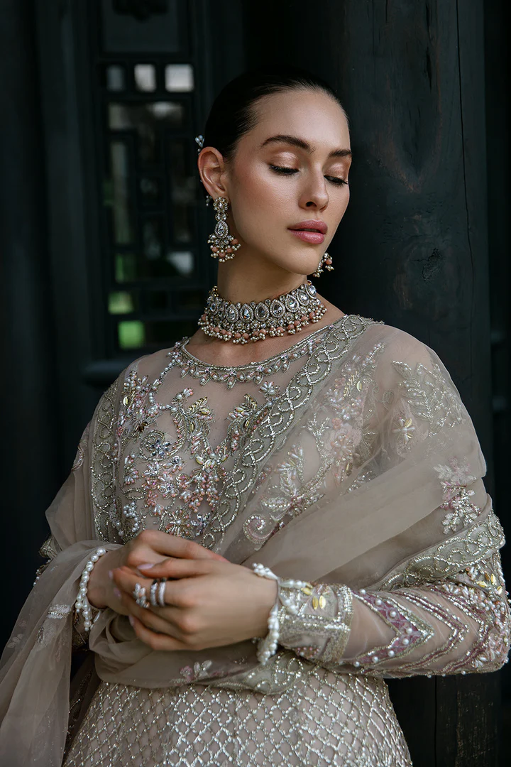A premium net dupatta in matching pink completes the ensemble. Heavily embellished borders, sequins, and delicate motifs enhance the overall charm, while the lined edges maintain structure and graceful drape.