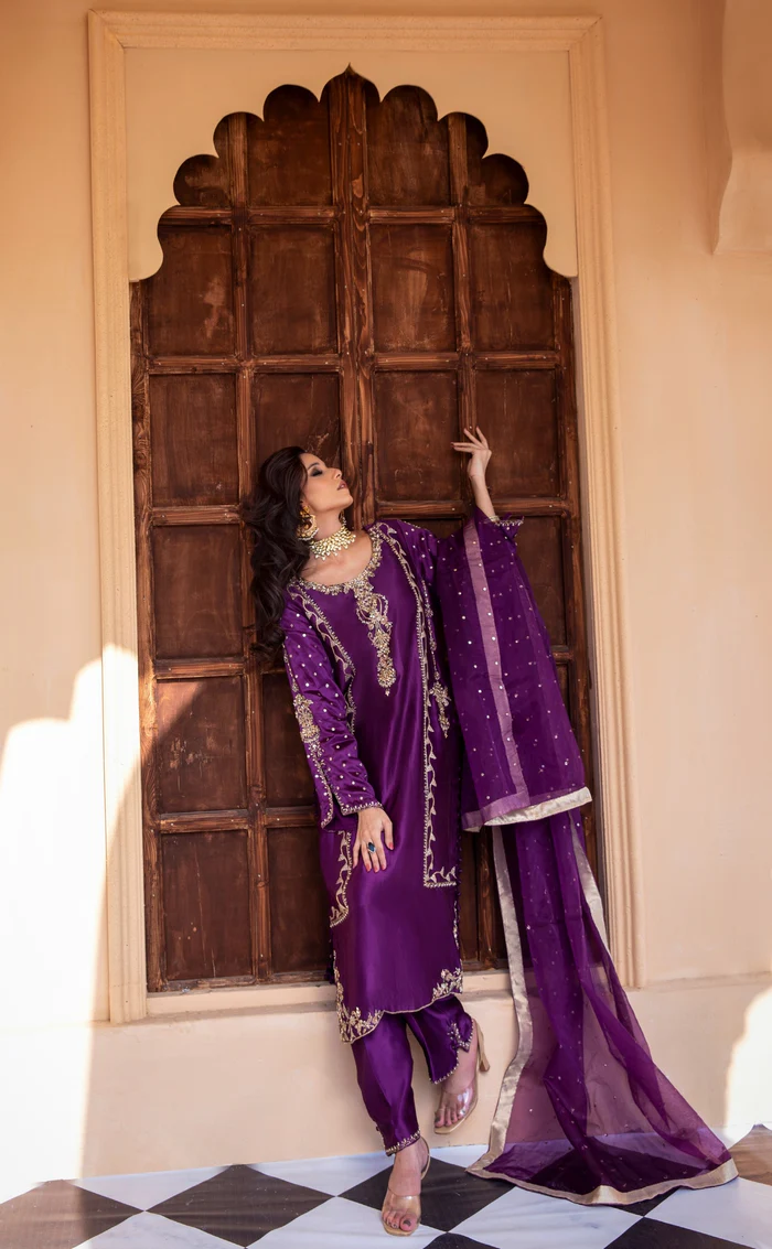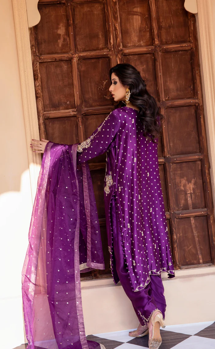 A regal purple outfit crafted in luxurious sheesh silk, adorned with fully handmade embroidery and paired with an ethereal organza dupatta for timeless elegance.