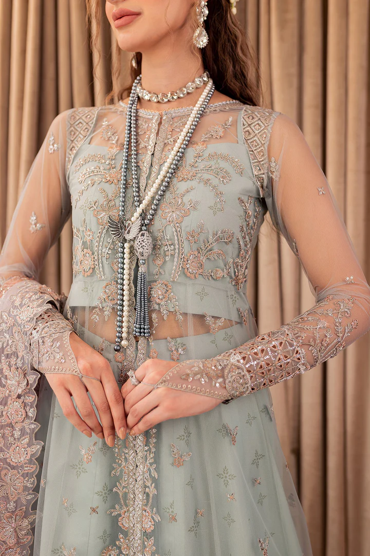 Completing the ensemble is a delicate net dupatta that enhances the overall elegance of this aqua Pakistani wedding dress. The dupatta features embellished borders and fine threadwork that echo the detailing of the gown shirt. Handworked accents add a polished finish, allowing the dupatta to fall gracefully while elevating the ensemble’s festive appeal.