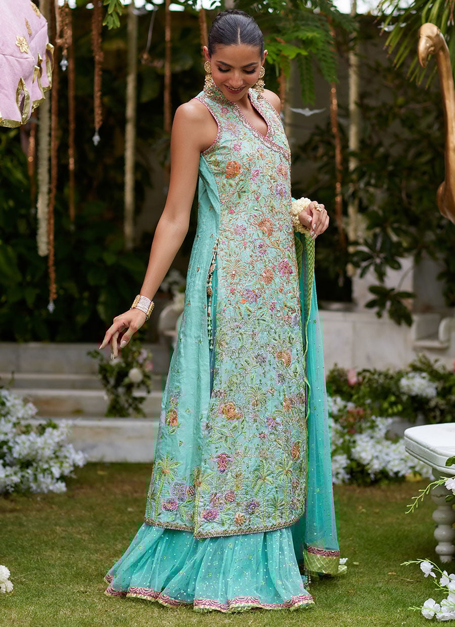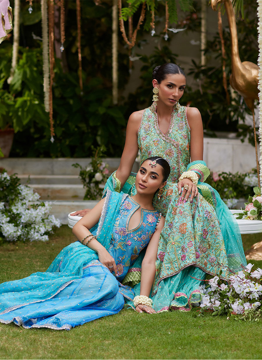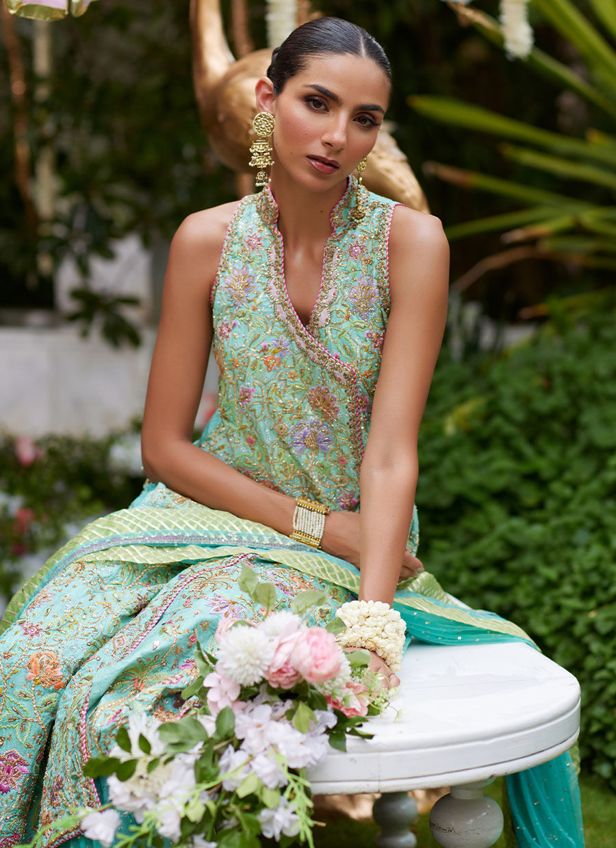 Fresh, elegant, and timeless, this aqua-mint angharkha set is exquisitely handcrafted with luminous embellishments, offering a perfect balance of traditional charm and contemporary refinement.