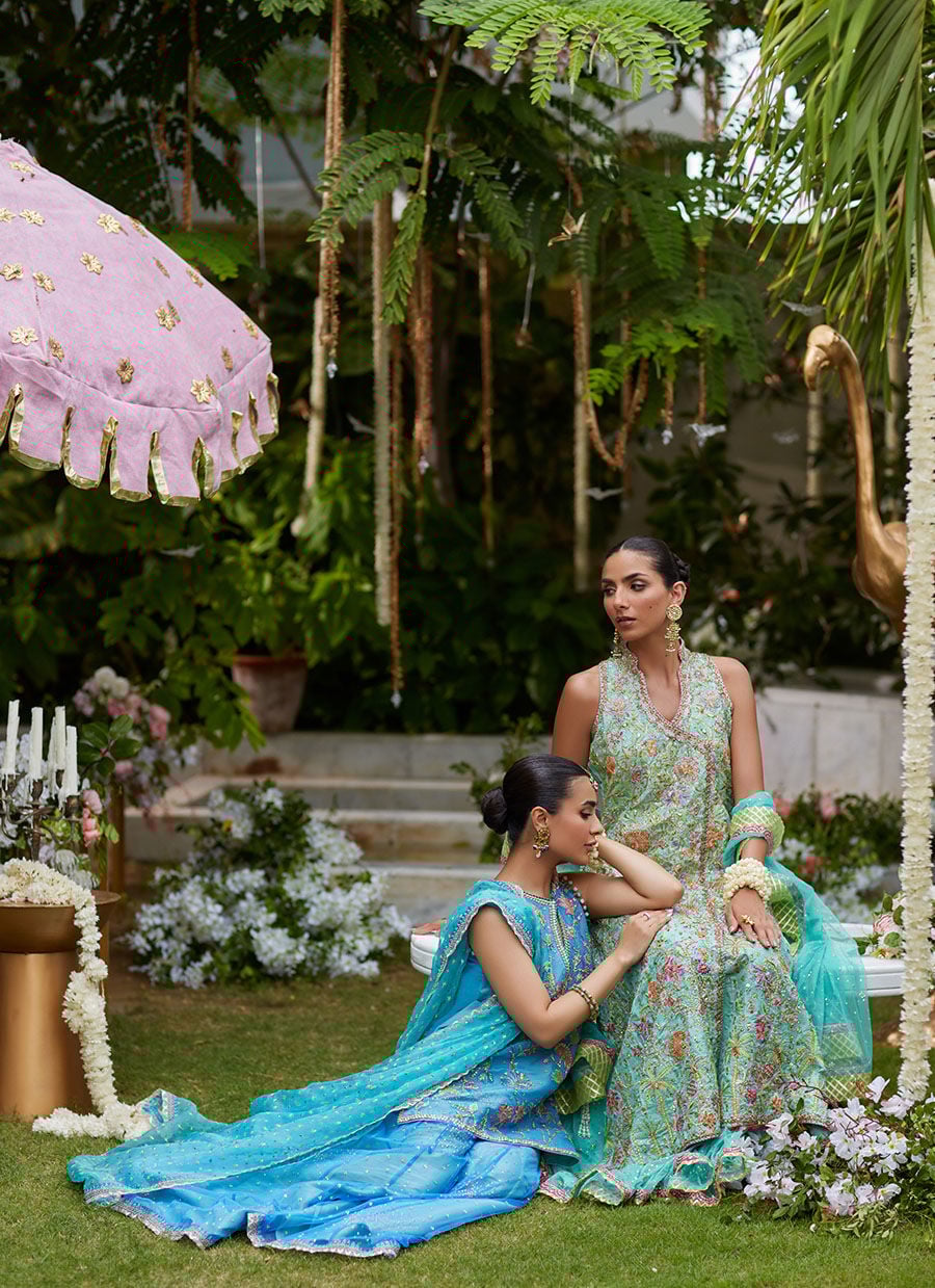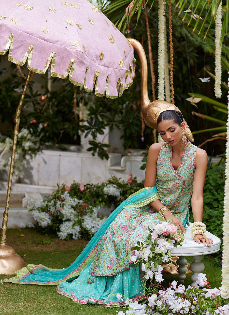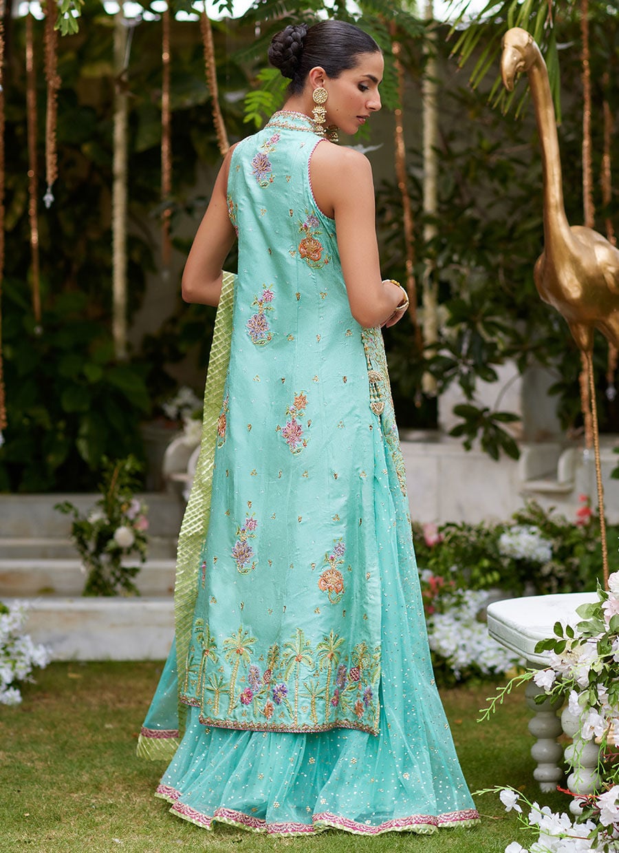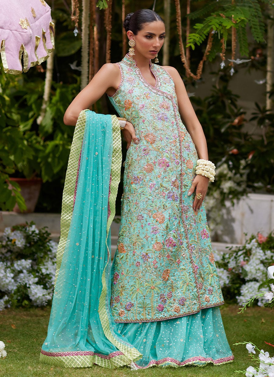 Fresh, elegant, and timeless, this aqua-mint angharkha set is exquisitely handcrafted with luminous embellishments, offering a perfect balance of traditional charm and contemporary refinement.
