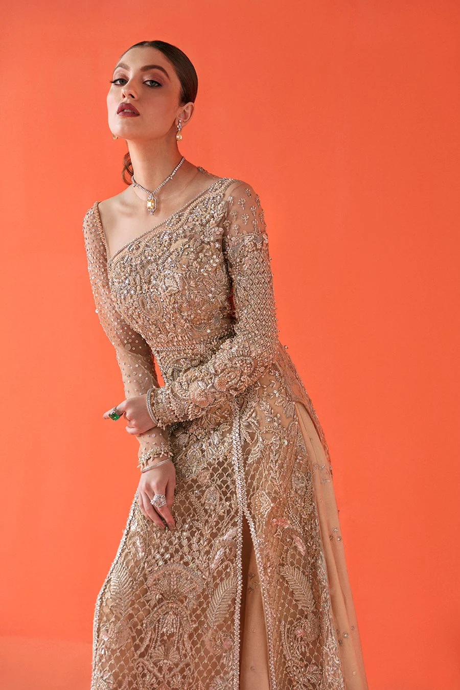 Make an unforgettable bridal statement with the Asel ensemble, featuring a luxurious gold long shirt adorned with zardozi, Swarovski, and real pearls, paired with a hand-embellished maysuri net lehenga. This contemporary bridal design blends Mughal-inspired grandeur with modern sophistication.