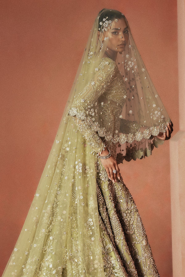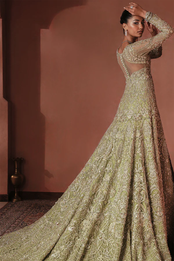 An ethereal bridal and formal ensemble in soft sage green, featuring a flowing trail back and intricate handwork with naqshi, dabka, mirror accents, mukesh, fine cutwork, and 3D elements for a show-stopping, regal effect.