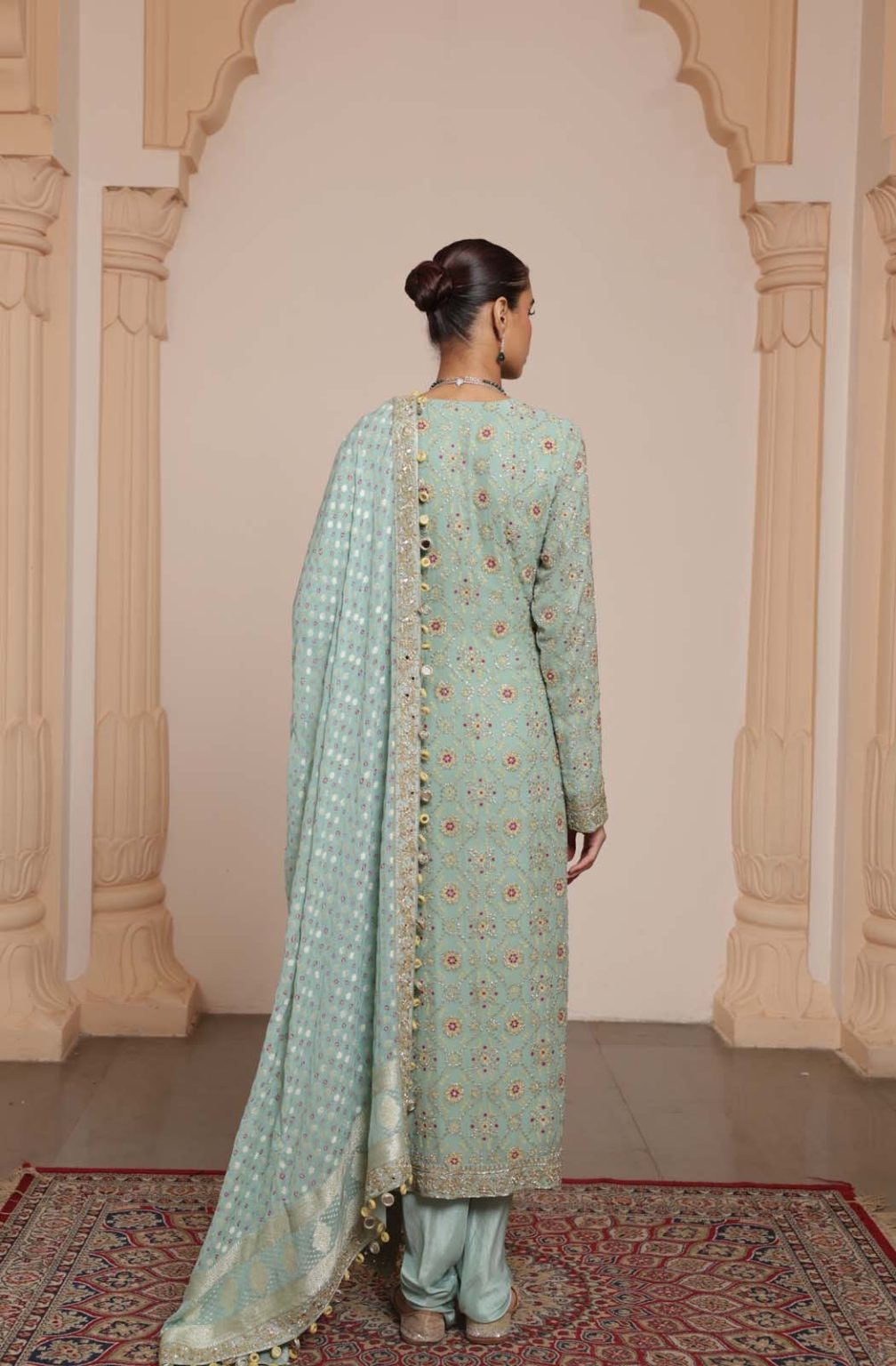 The kurta is crafted in a soft light blue base with exquisite rose gold and multicolored thread detailing. Mirrorwork and cutdana are carefully applied by hand to enhance the bandhani pattern, creating a sophisticated and textured look. The tailored silhouette ensures both elegance and comfort for ceremonial occasions.