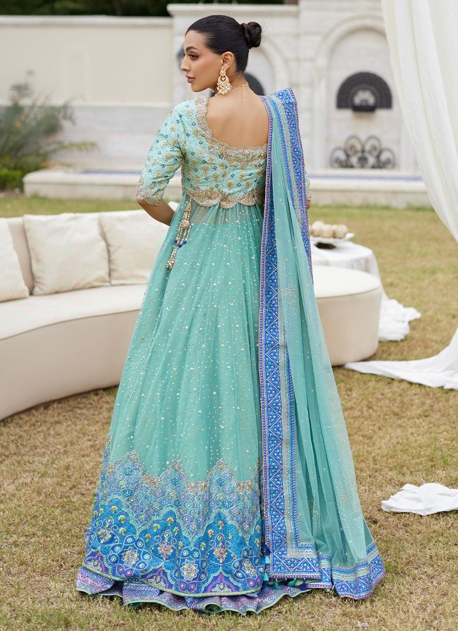 The kalidar is designed in serene aqua and deep blue ombré tones, crafted from a graceful blend of net and printed raw silk. Its flowing panels create a fluid silhouette, enhanced with intricate hand-applied embellishment. Fine detailing featuring crystals, sequins, and traditional metalwork is complemented by resham accents in soft blue and lavender hues, adding depth and artistic contrast to the overall design.