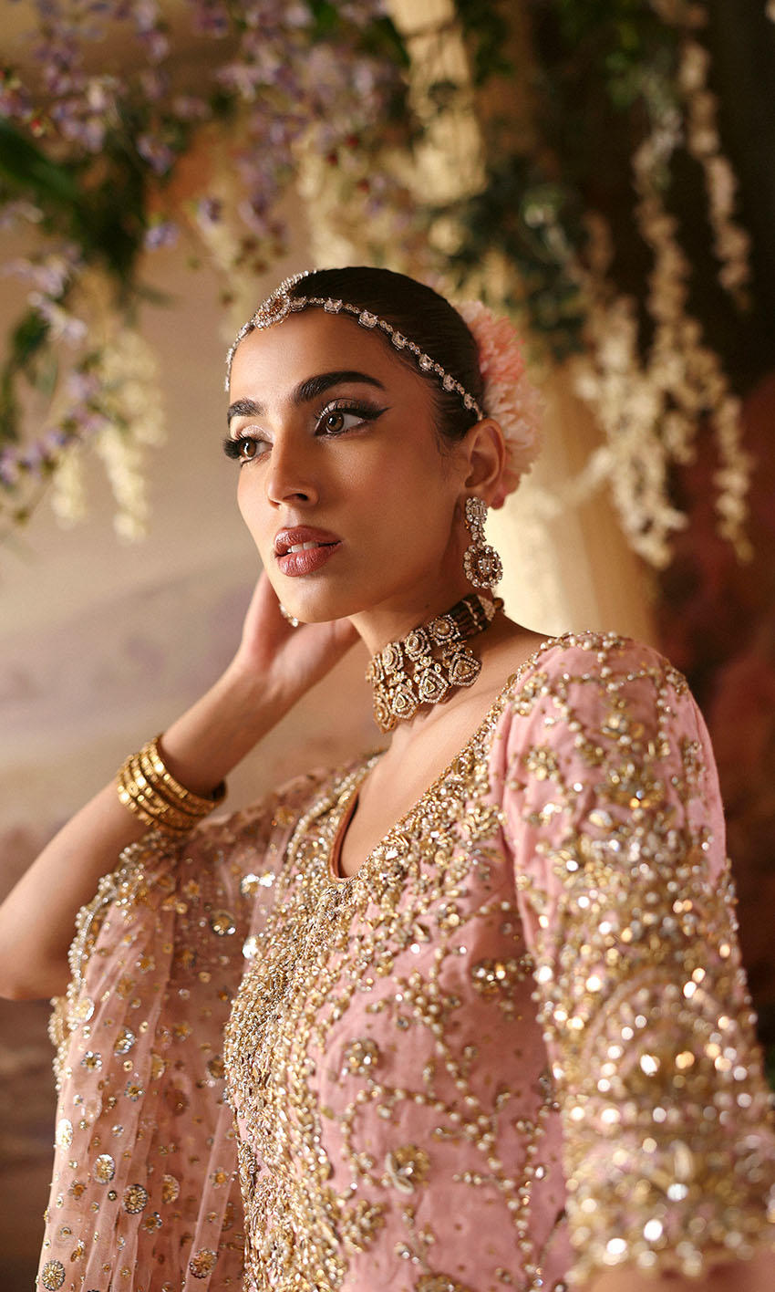 A delicate light pink outfit featuring a handworked cotton net shirt, a richly detailed raw silk dhaaka, and a sequined scalloped net dupatta for an elegant and timeless appearance.