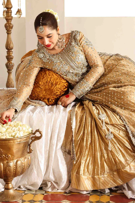 A regal gold tissue ensemble featuring a long shirt and bustier with hand-applied dabka, naqshi, wasli, and mukaish, paired with a crushed sharara and coordinating dupatta, offering timeless elegance for weddings and festive events.