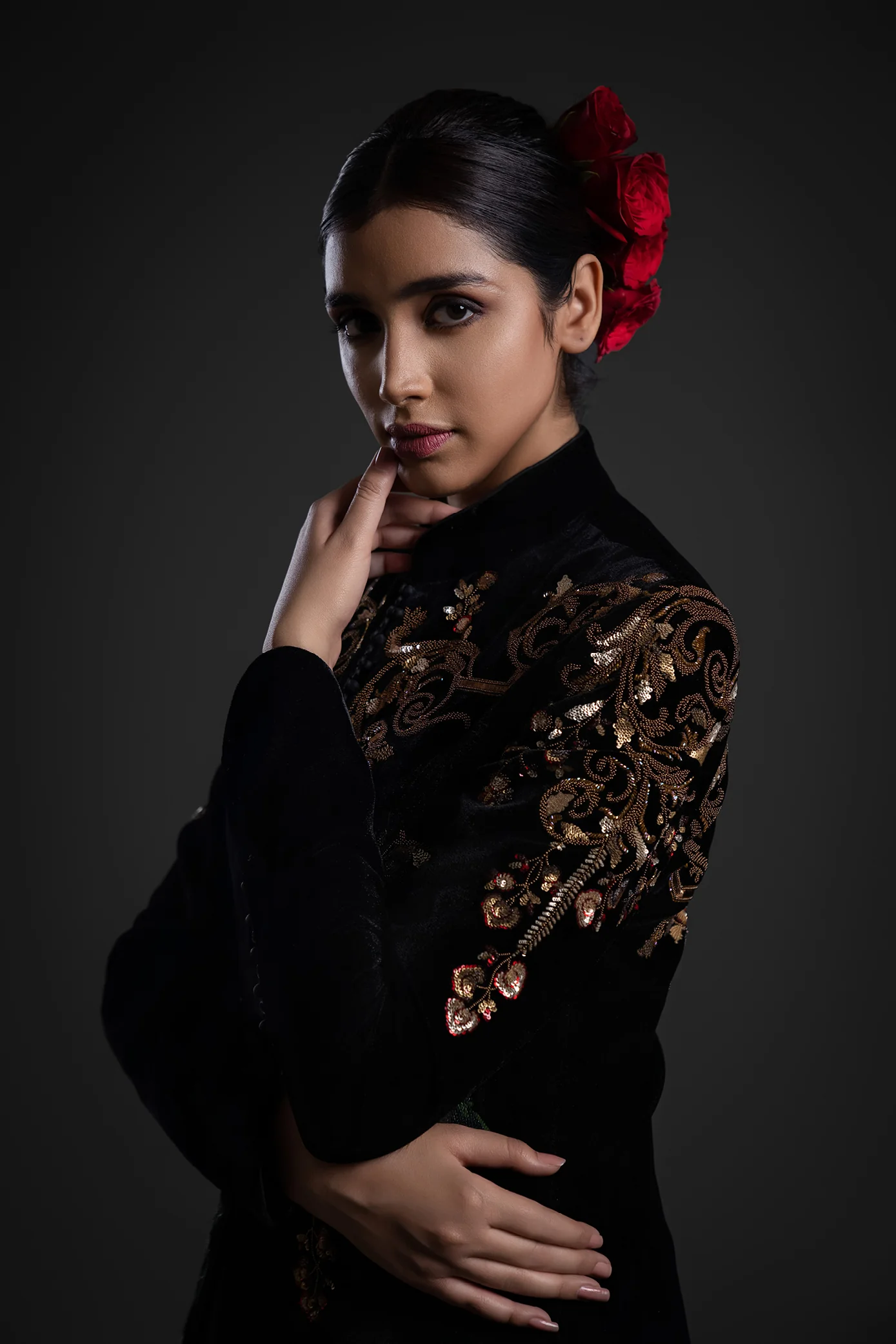 Intricate embroidery applied with precision to enhance the richness of the velvet base.