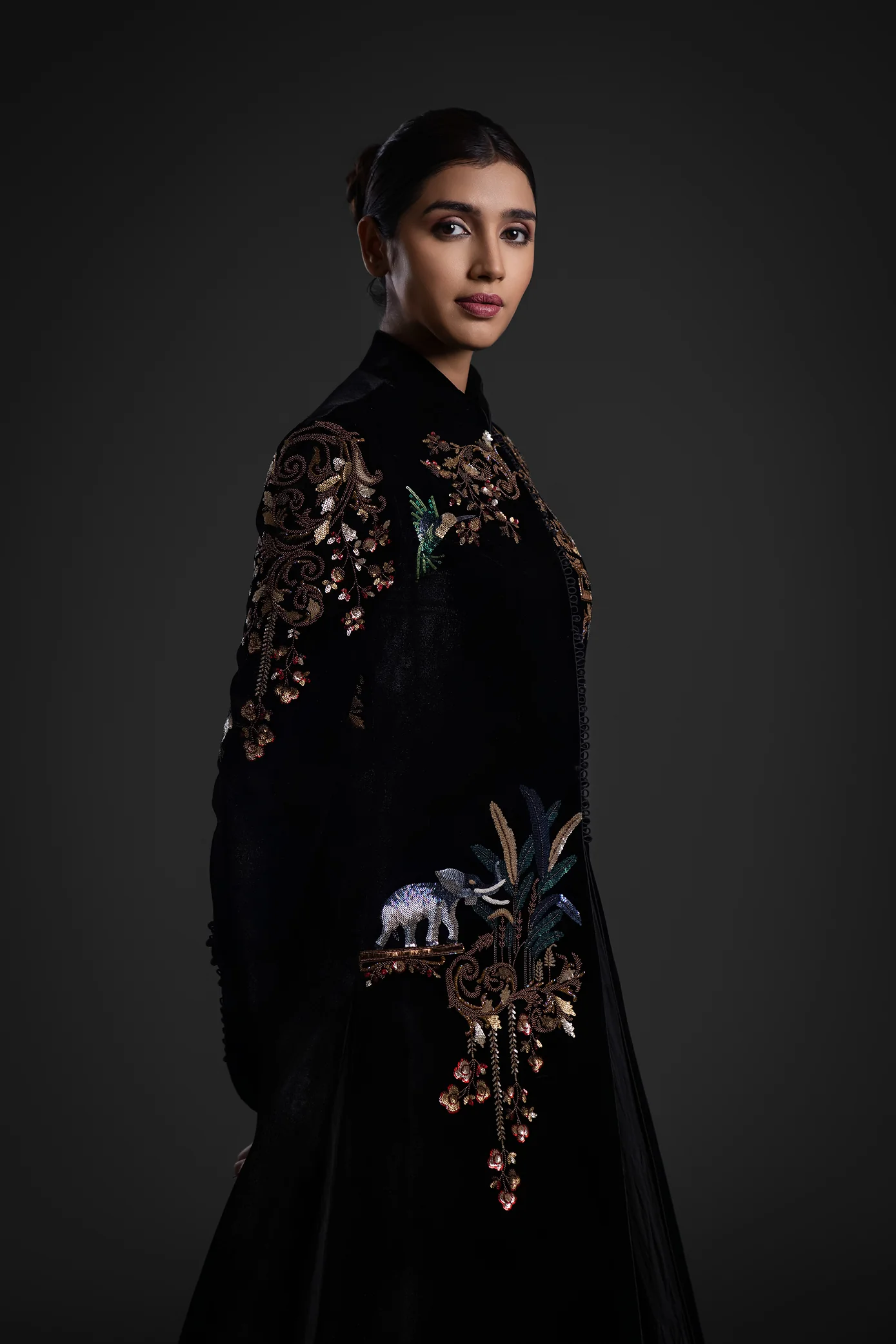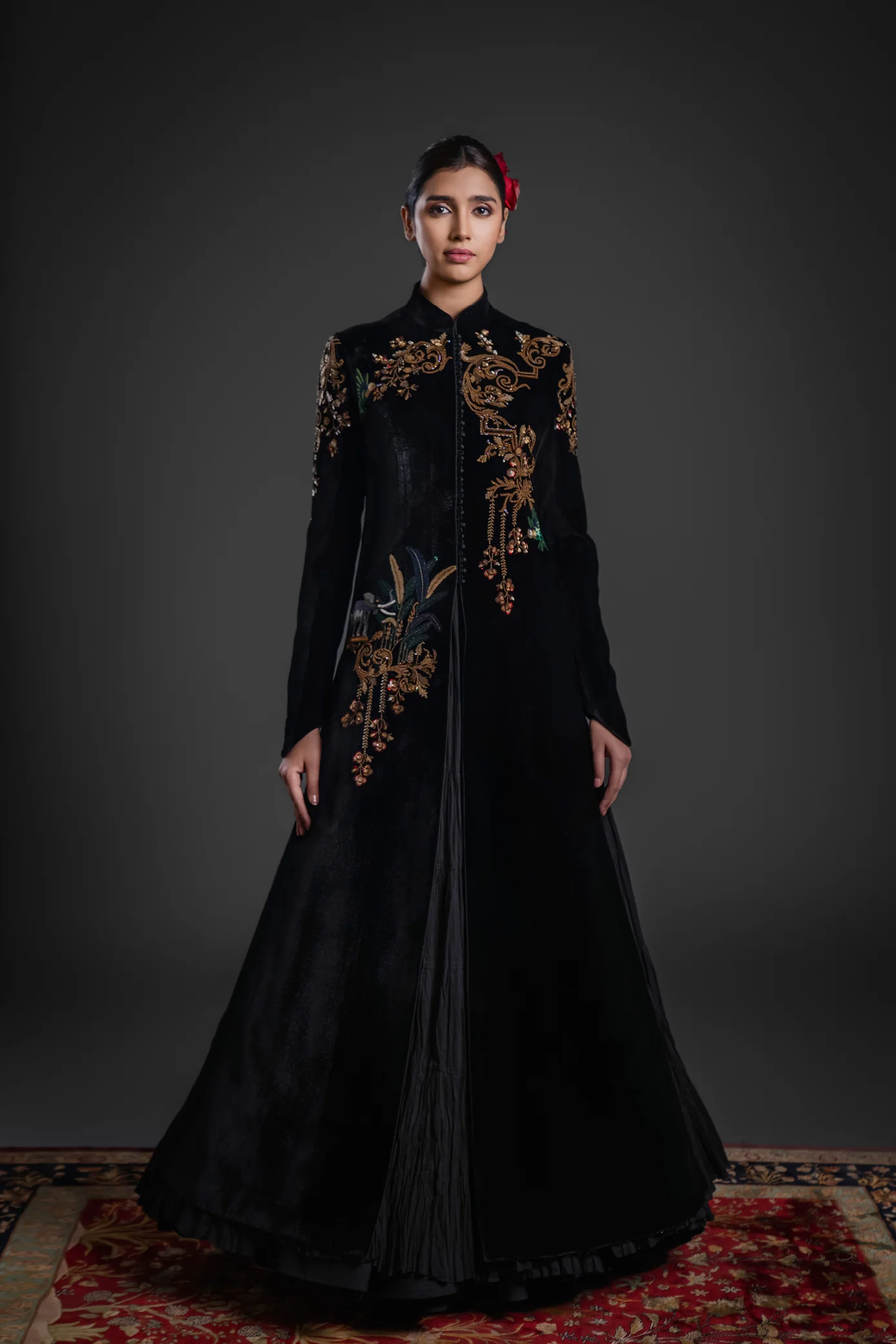 This long jacket is tailored from luxurious velvet in a classic black shade, offering depth, richness, and a regal finish. Detailed embroidery adorns the front panels, neckline, and sleeves, adding visual interest through carefully placed patterns and textures. The jacket features polished inner finishing for comfort, while clean edges and structured tailoring contribute to a refined silhouette suitable for formal events.