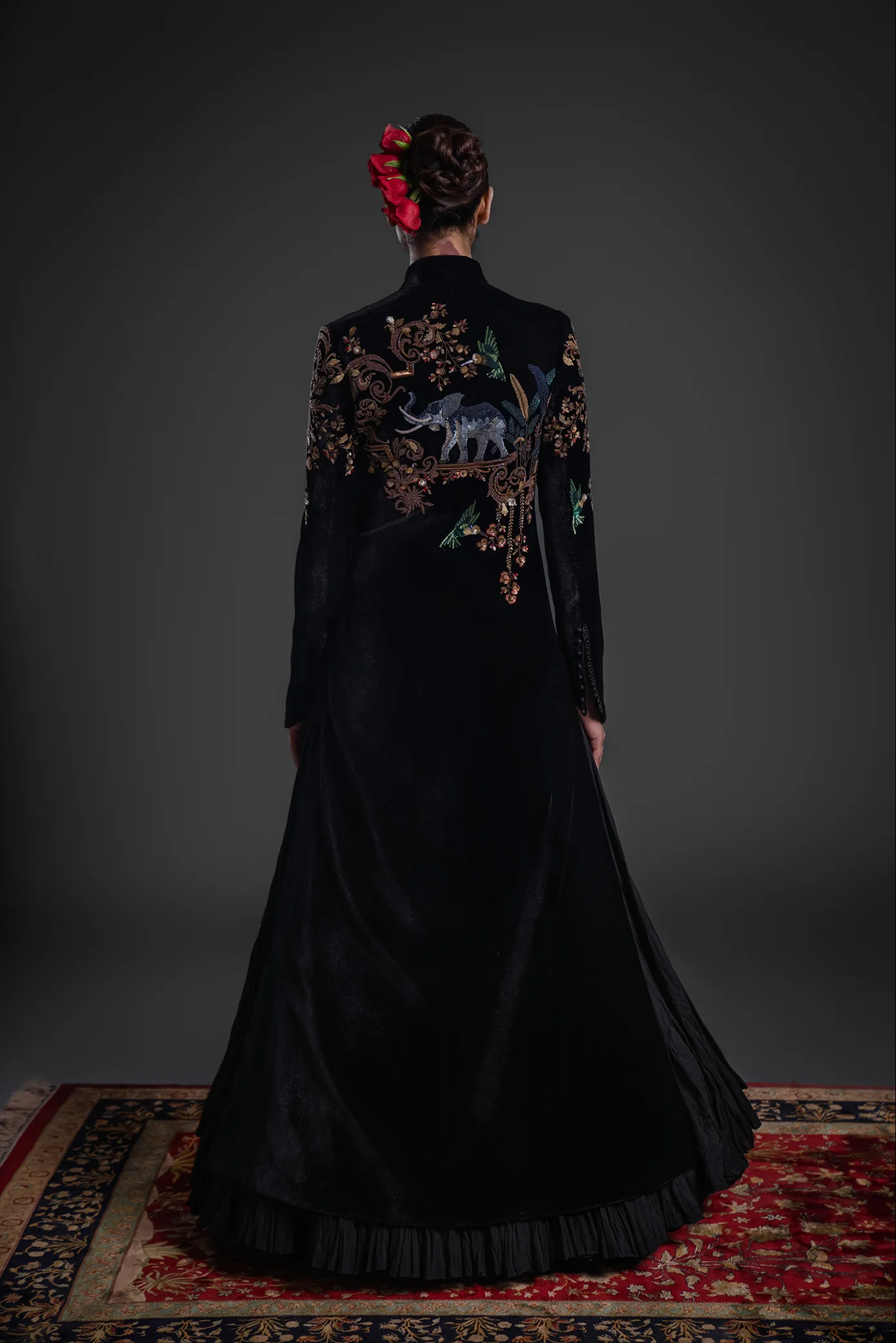 Dry clean only. Use gentle steaming from the reverse side to maintain the velvet’s texture. Store in a garment bag to protect the fabric and embroidery.