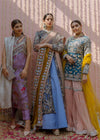 An elegant blue bridal ensemble featuring a front-open net gown adorned with lavish jungle-inspired silver embroidery and long tassels, paired with a chic raw silk skirt for a modern, regal look.
