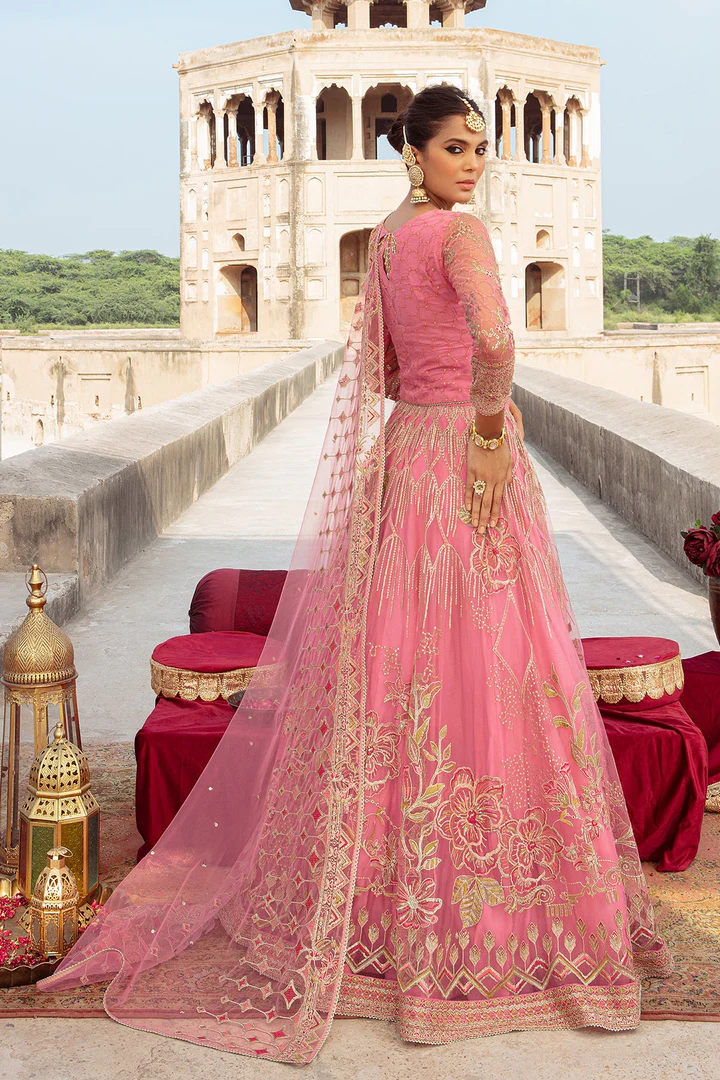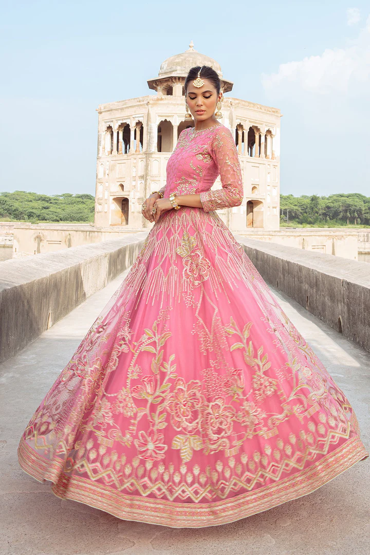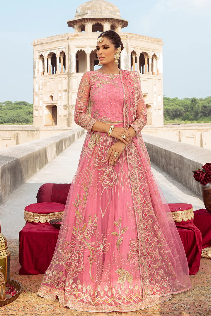 A stunning pink bridal ensemble featuring a beautifully embroidered choli, a flared raw silk lehenga with intricate thread and cut-dana work, and a delicate net dupatta with scalloped borders for a perfect wedding look.