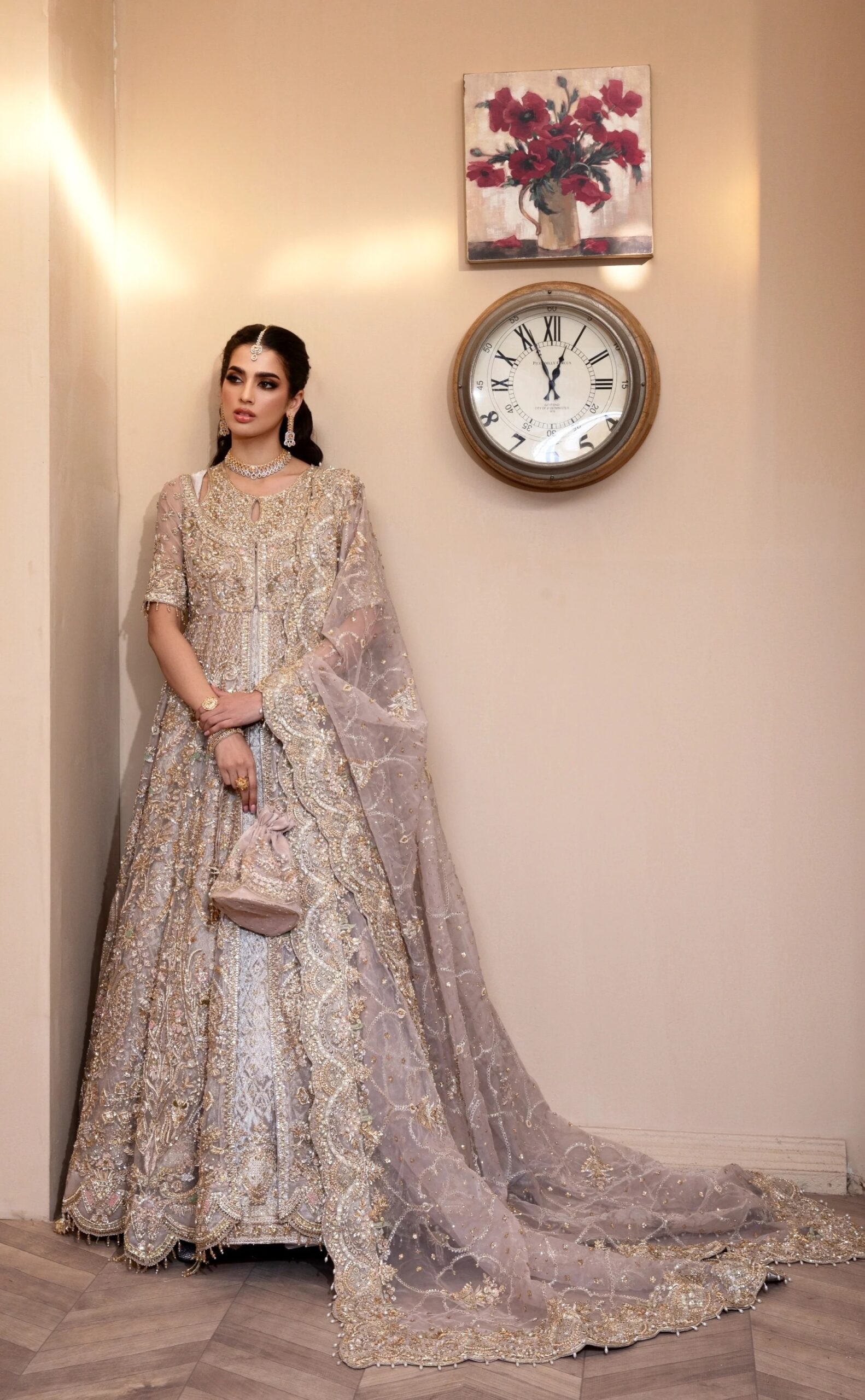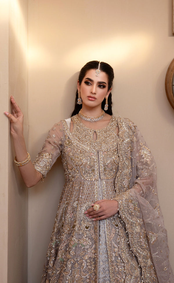 The accompanying dupatta is made from pure organza, designed to drape effortlessly and complement the gown. Its subtle sheen and soft texture enhance the ensemble’s overall elegance.