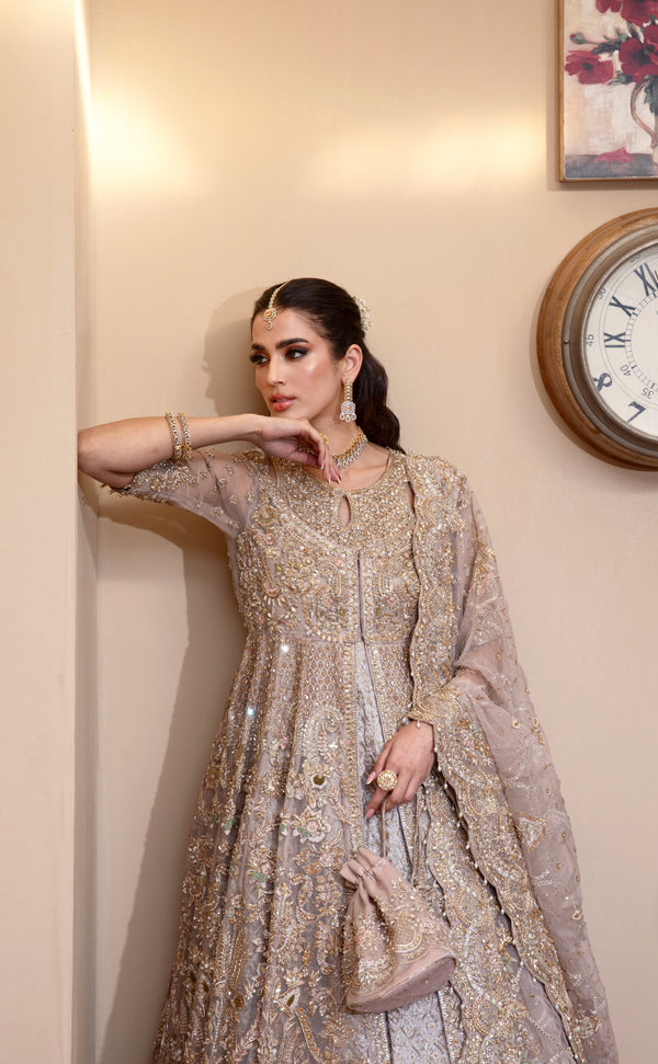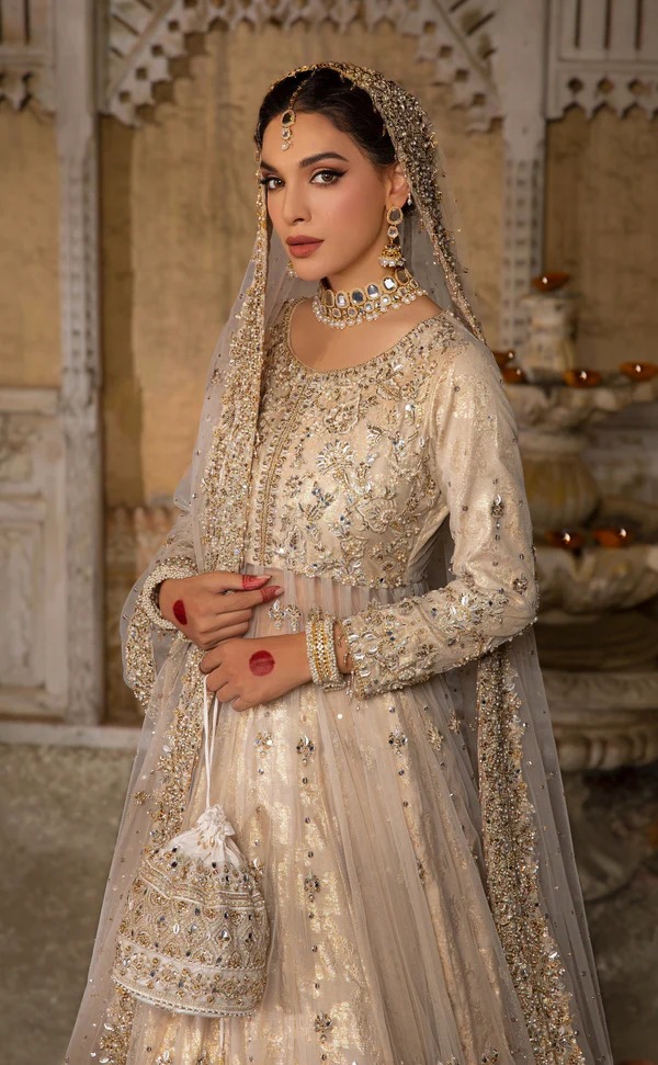 The gown is crafted in a soft nude peach shade from premium organza, offering a flowing and elegant silhouette. Intricate embroidery motifs are applied with precision, incorporating ribbons, diamantes, sequins, pearls, crystals, dabka, and naqshi detailing. The combination creates a radiant, dewy finish that highlights sophistication and contemporary charm.