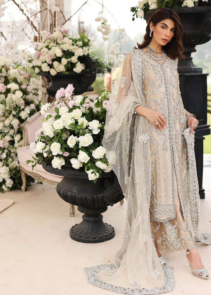 The dupatta is crafted from delicate net in a coordinating pink hue, bordered with detailed embellishment and refined golden appliqué. Sequins, beads, and delicately placed motifs lend gentle radiance throughout, while the lightweight texture allows for an airy, graceful drape.