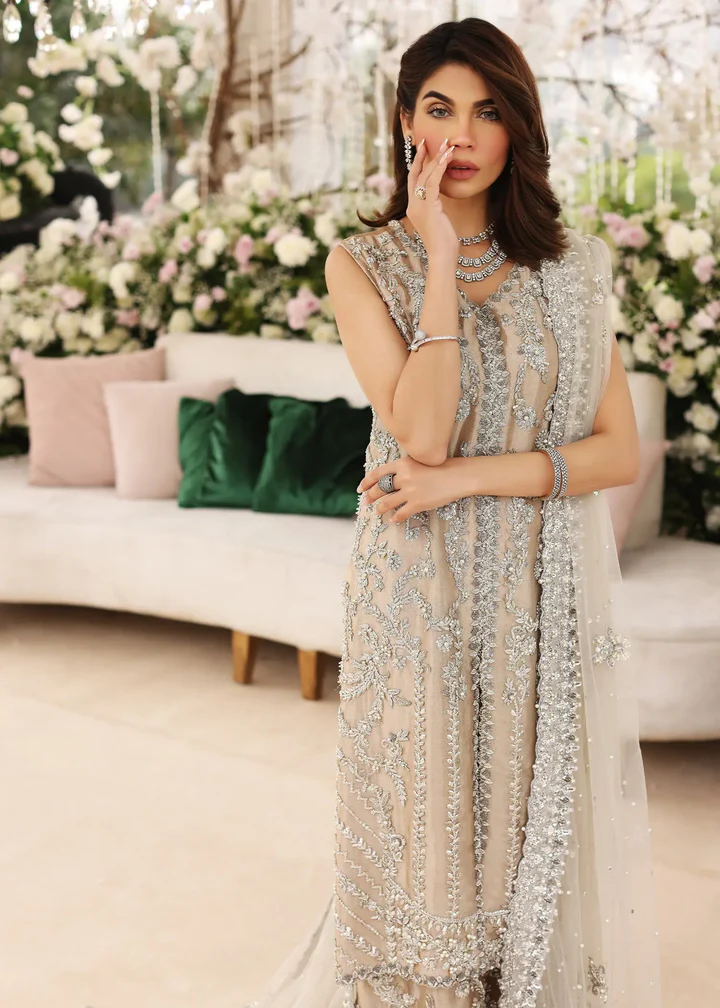 Completely handcrafted using sequins, beads, Swarovski crystals, cut-glass details, kora, naqshi, and tilla embroidery. Slight artisanal variations may occur, celebrating the authenticity of hand craftsmanship.