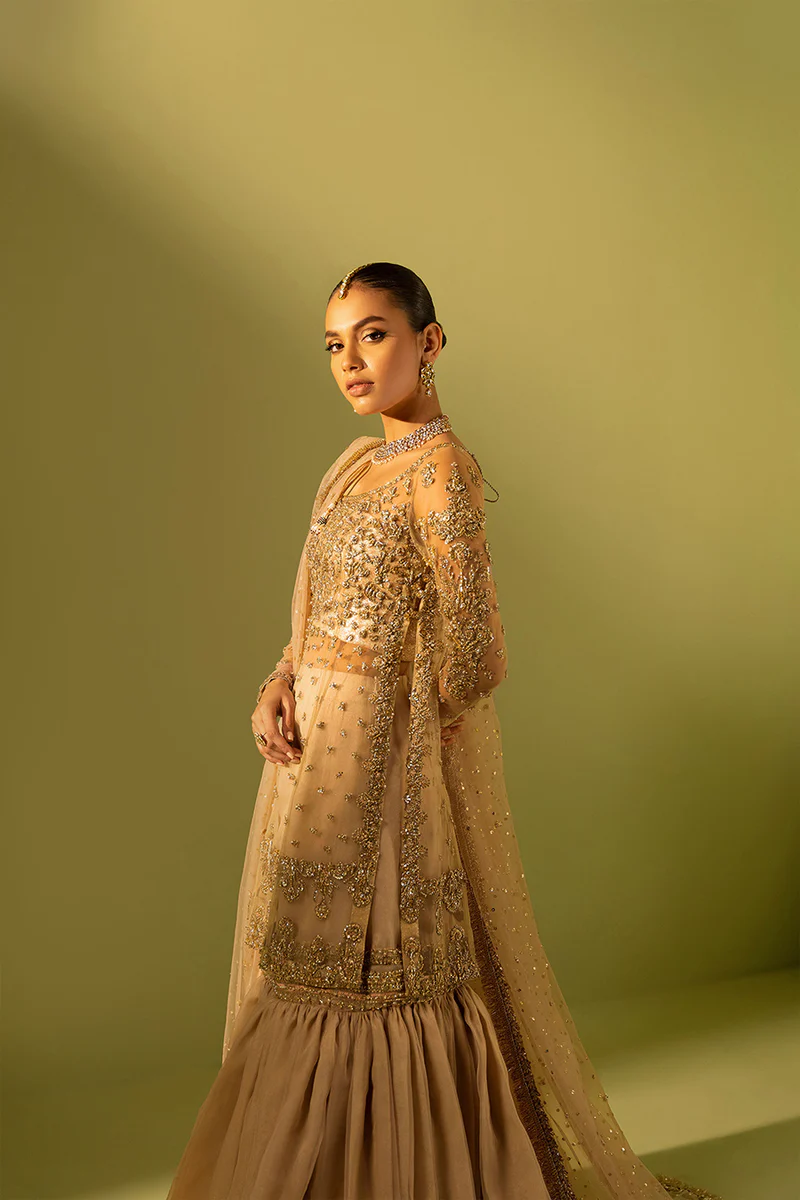 A nude pink net and organza gharara set featuring a richly embellished shirt, silk brocade bustier, and a motif-sprayed net dupatta with kiran finishing—ideal for a soft yet statement-making festive or bridal look.