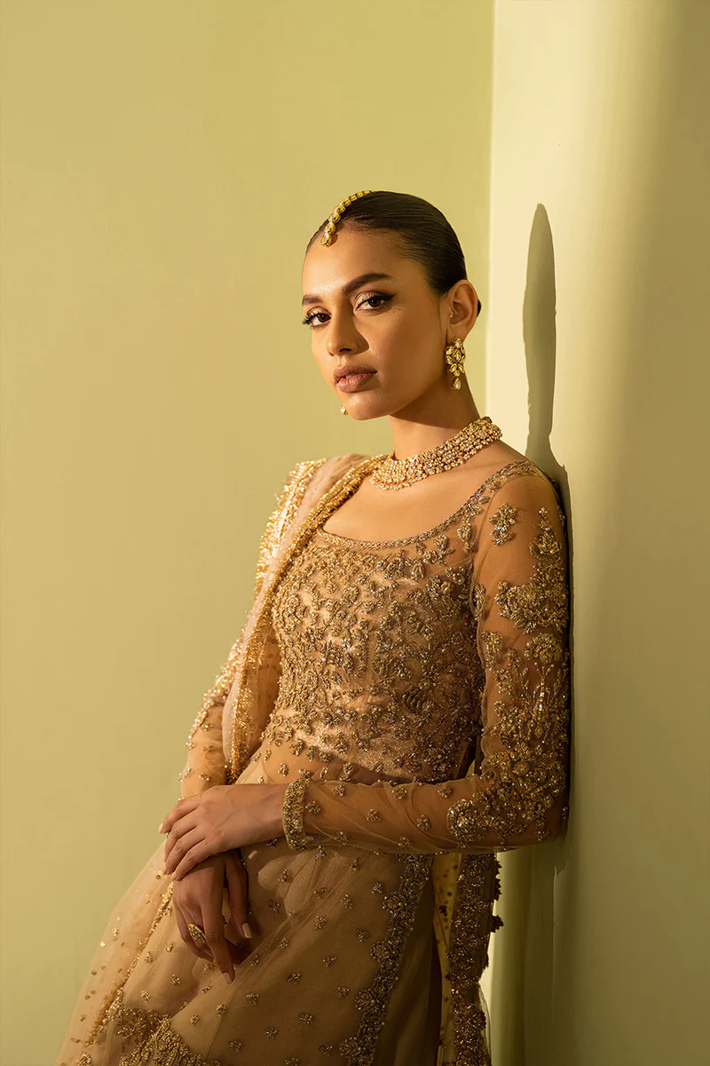 Zardozi, sequins, pearls, floral motifs, and kiran edging, all applied by hand on net, silk brocade, and organza for a rich yet delicate finish.