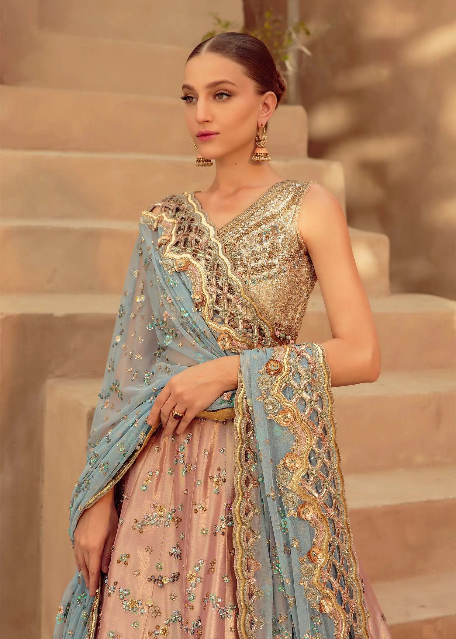 A soft blush pink lehenga adorned with delicate hand embellishments, paired with a shimmering gold blouse and an ethereal ice-blue dupatta for a graceful couture statement.