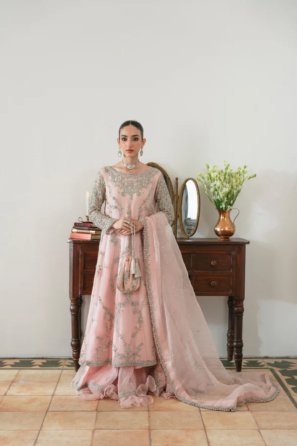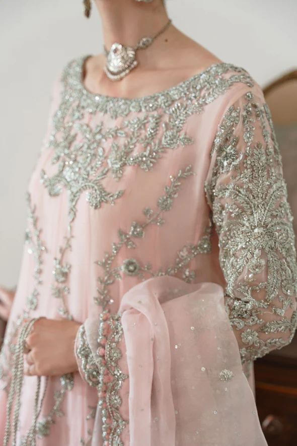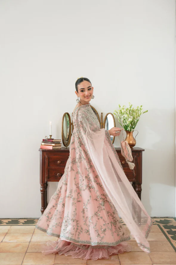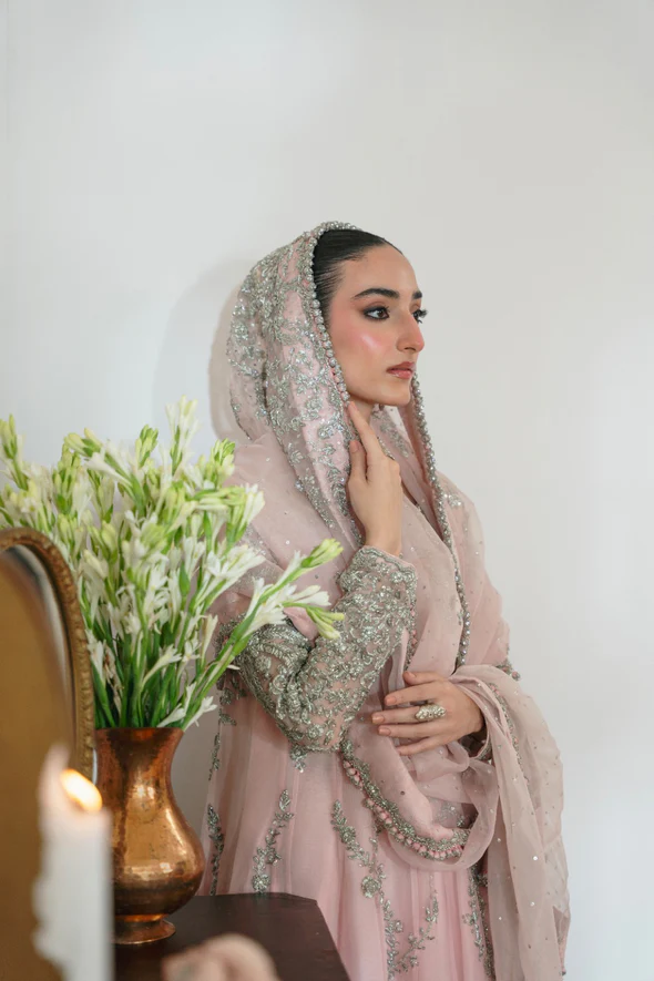 A breathtaking blush pink bridal ensemble featuring a flowing kalidaar silhouette richly adorned with silver ada handwork, paired with a luxurious embellished dupatta and a refined panelled skirt for a truly regal bridal look.