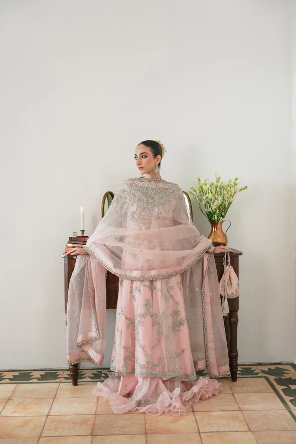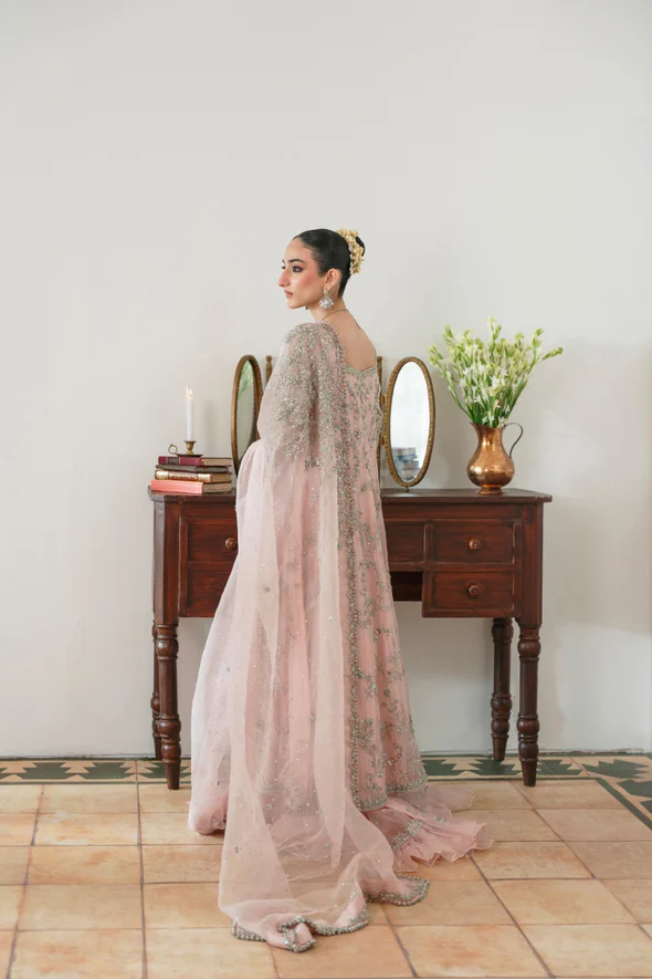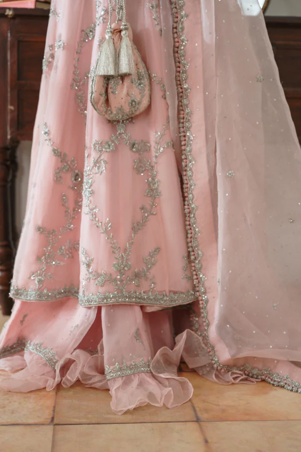 The kalidaar is crafted from pure soft tissue in a delicate blush pink tone and designed in a dreamy, flowy silhouette with a length of 50 inches. It is heavily embellished with intricate silver ada handwork, enhancing the panels with luminous detailing and graceful movement. Brocade finishings accent the borders and edges, adding richness and depth to the design. A smooth inner lining ensures comfort while preserving the structured elegance of this statement bridal piece.