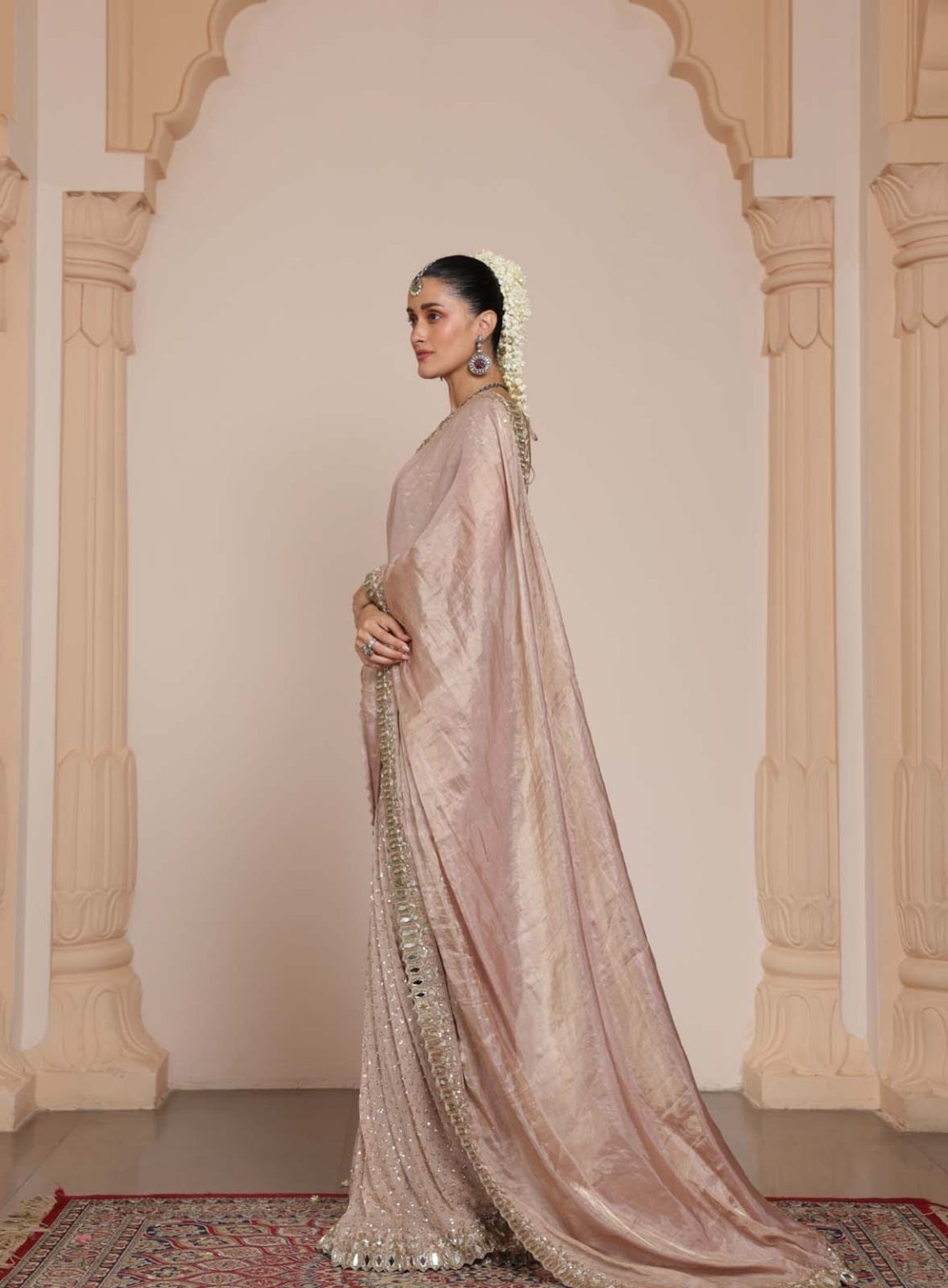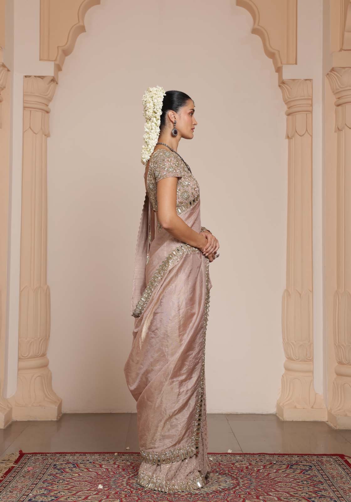 An elegant old-rose saree and blouse set featuring intricate tissue work with rose-gold mirror, cutdana, and kasab hand embroidery, perfect for weddings and festive occasions.