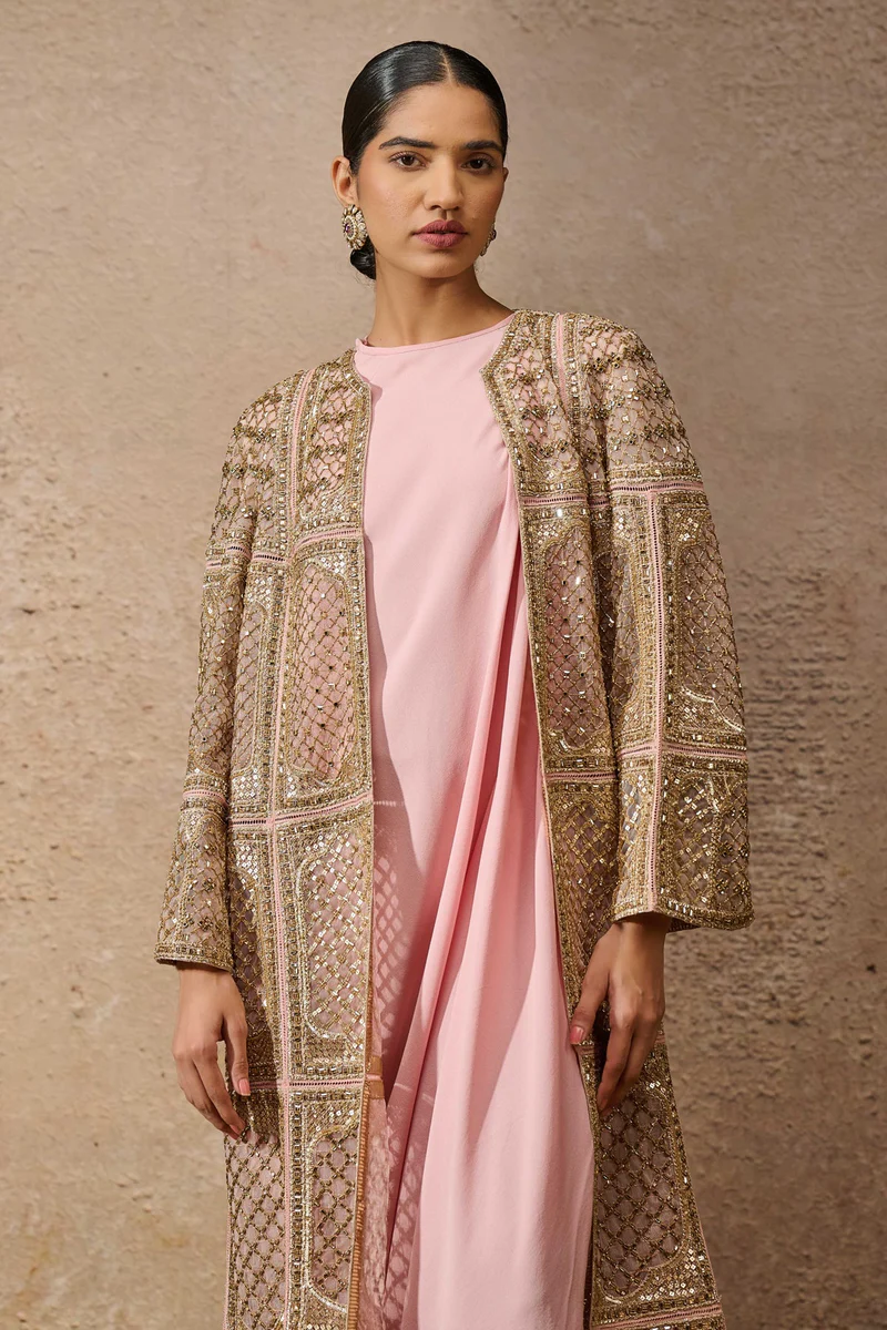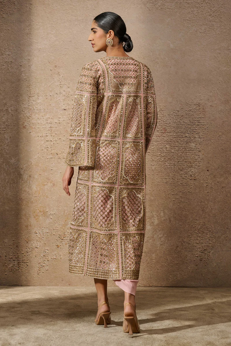 The top is designed as an elongated, open-front coat silhouette crafted from a delicate blush-toned mesh base. The entire surface is divided into structured rectangular panels, each featuring intricate geometric lattice-work and arch-inspired golden embroidery. The front opening, high collar, and hem are heavily defined with ornate golden tilla and sequin borders, creating a luminous contrast against the soft pink palette. The sleeves are designed with a contemporary flared finish, echoing the rich decorative patterns found throughout the coat. An inner silk-blend slip in matching blush rose ensures a smooth, opaque foundation and maximum comfort.