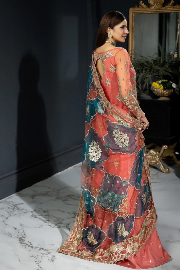 The kameez is designed in a soft rose pink shade using premium chiffon net fabric that provides a graceful drape and structured silhouette. Hand-applied embellishments, gold accents, and sitara work on the neckline add an elegant sparkle, while intricate embroidery throughout enhances the garment’s luxurious appeal. It is paired with a cotton silk slip to ensure comfort and shape.