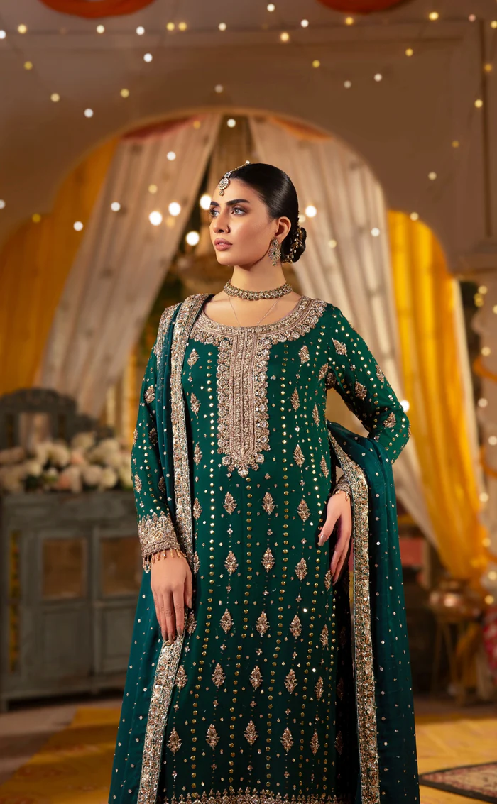 A regal bottle green ensemble featuring a crinkled chiffon mukesh shirt, intricately embroidered raw silk trouser, and hand-embroidered organza dupatta—perfect for weddings, formal events, and festive occasions.