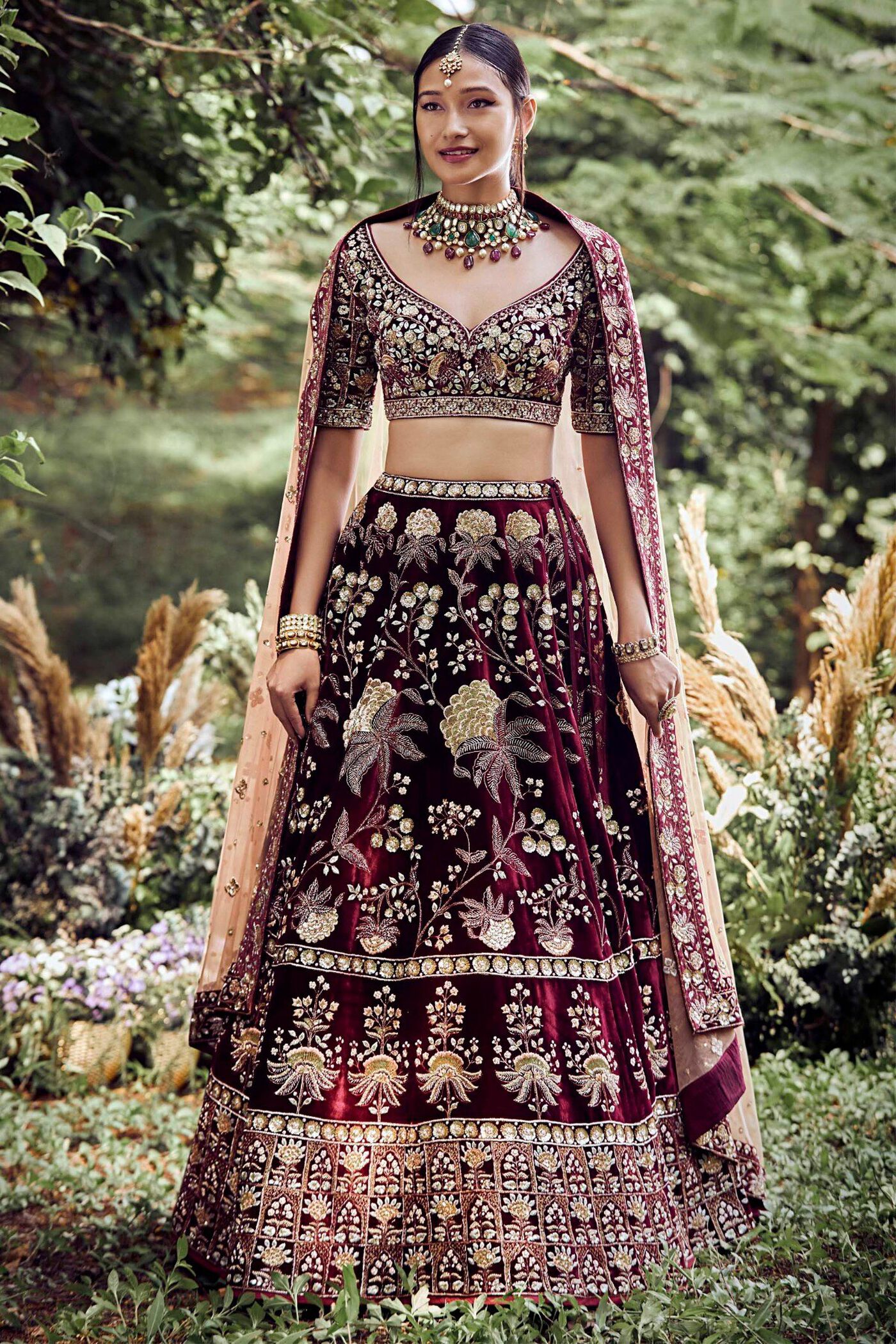 A majestic embodiment of traditional luxury, this ensemble features a deep burgundy velvet lehenga and matching choli, masterfully adorned with gold zardozi and antique tilla embroidery for a truly regal bridal statement.