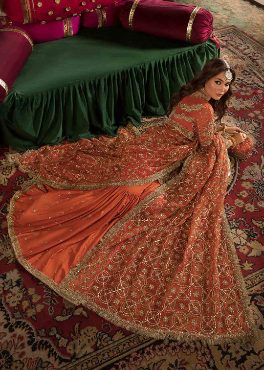 Completing the ensemble is a gorgeous burnt orange dupatta featuring richly embellished thick borders that add depth and luxury to the outfit. Paired with a crushed lavender sharara adorned with Swarovski crystals and detailed lace along the hem, the dupatta brings together contrast and opulence. This final touch ensures a bold, memorable appearance that truly stands out in any crowd.