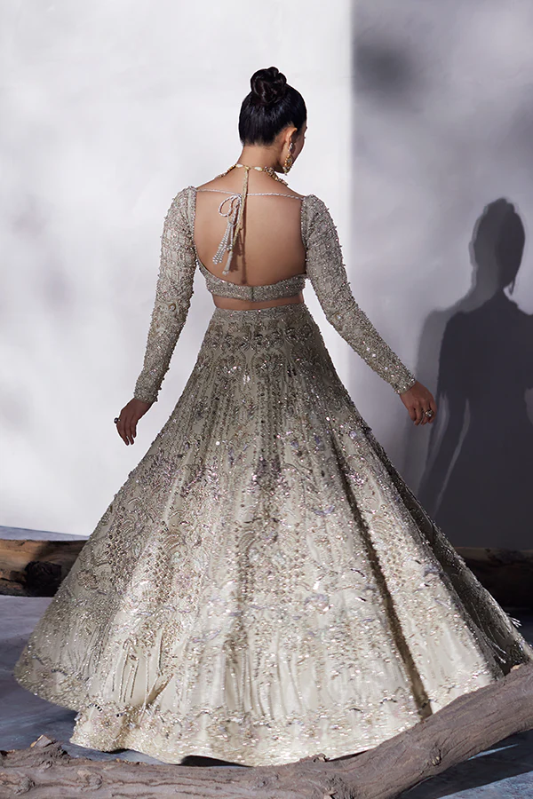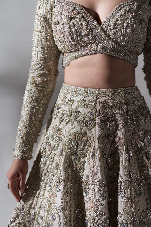 The dupatta is rendered in a sheer, lightweight fabric that drapes beautifully over the shoulders. Embellished with fine floral accents, pearls, and shimmering sequins, it adds a soft, ethereal layer that completes the bridal look with timeless elegance.