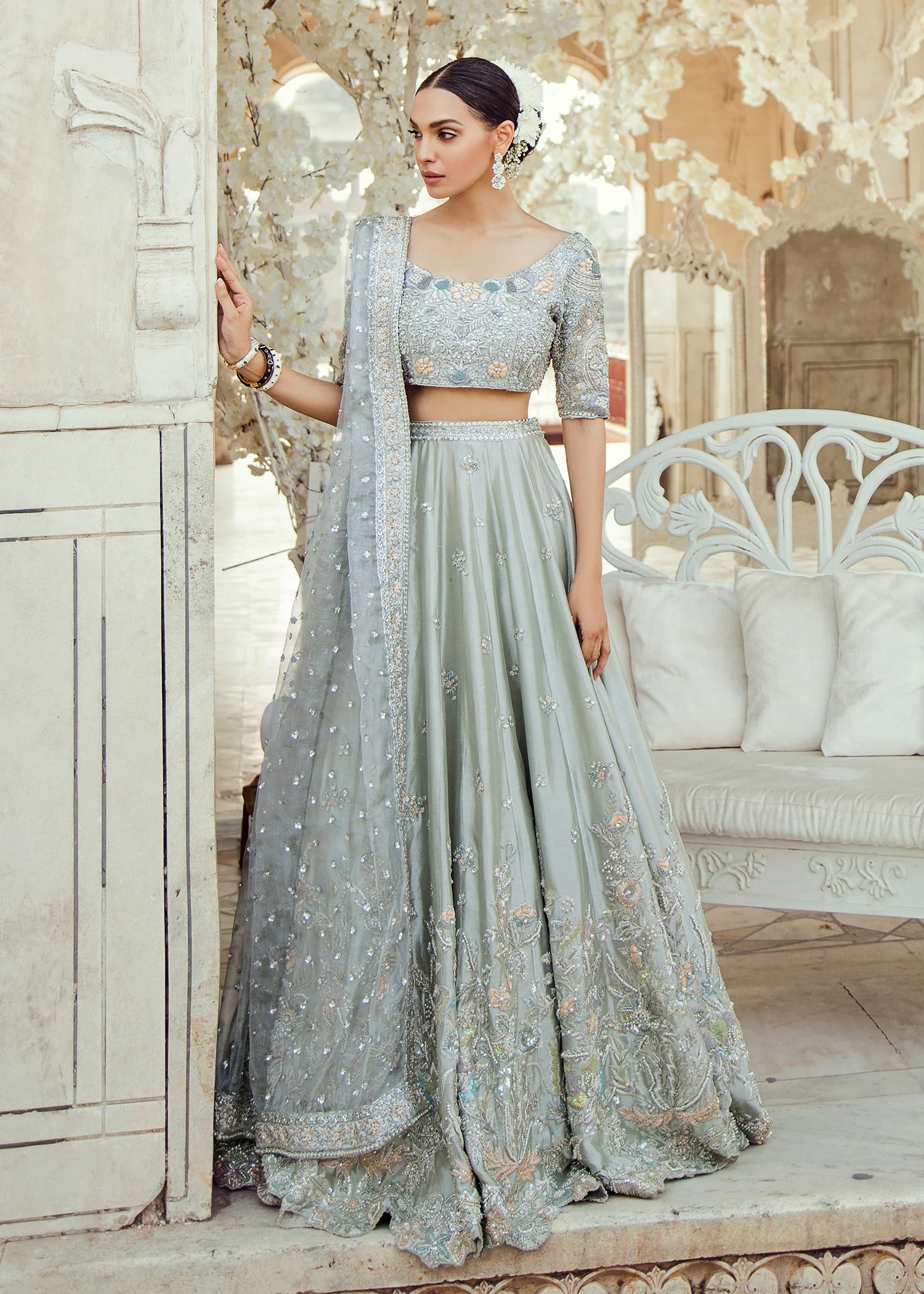 An ethereal sage-toned lehenga set adorned with delicate floral embroidery, shimmering beadwork, and soft pastel embellishments. The ensemble features a finely crafted blouse, a gracefully flowing lehenga, and a light embellished dupatta that together create a refined and elegant festive look.