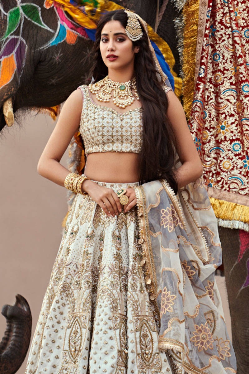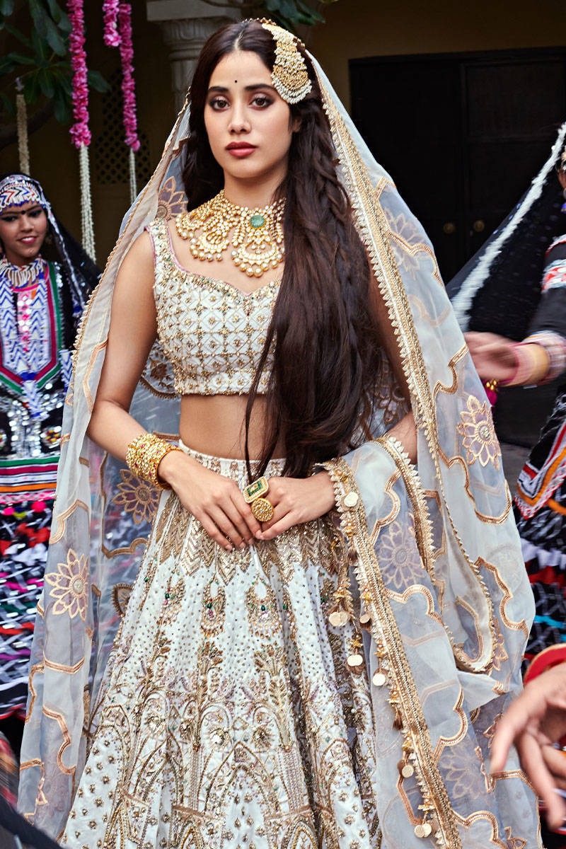 A refined bridal ensemble in pearl white and gold, where architectural symmetry meets delicate floral artistry for a look that is both timeless and effortlessly elegant.