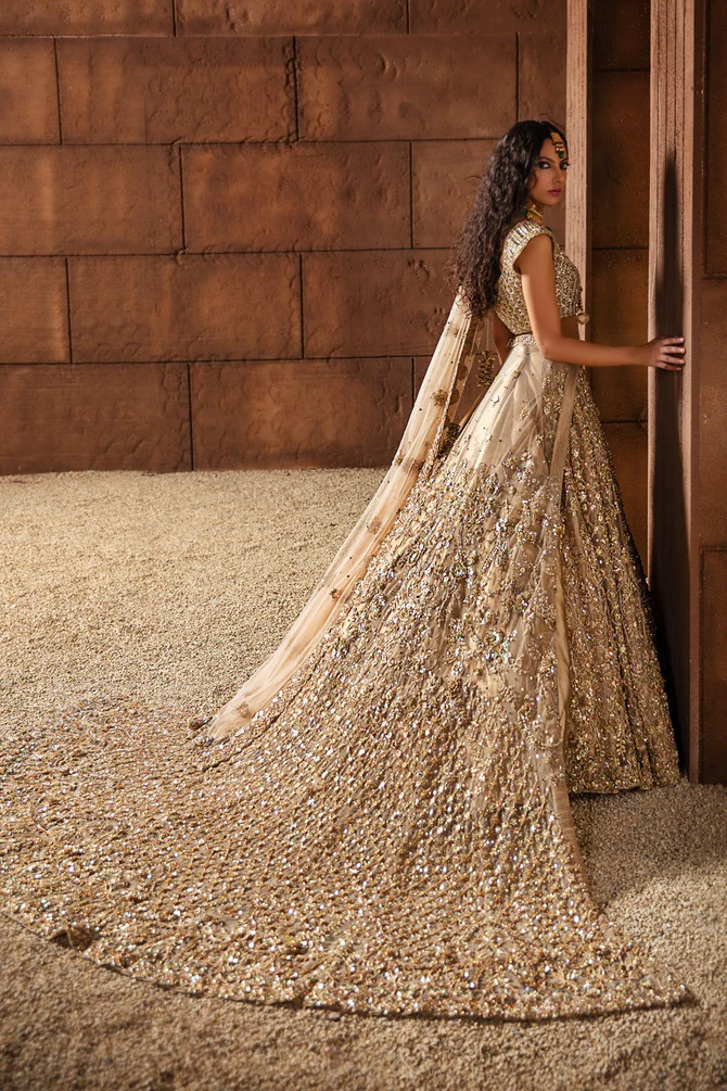 A stunning Pakistani bridal outfit in champagne net, featuring intricate copper-gold sequins, cut stones, and gotta work, complete with an extra-long tail for a regal and contemporary bridal look.