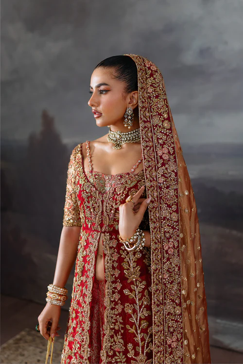 A timeless red formal ensemble crafted in pure khaddi silk, paired with a richly textured jamawar and karandi sharara and a luminous tissue dupatta for an elegant, heritage-inspired look.