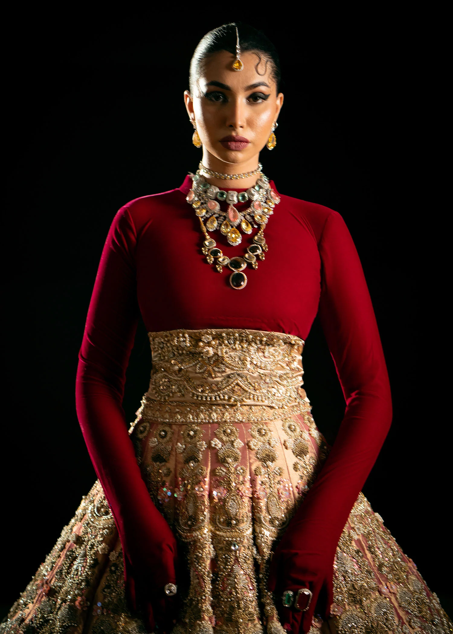 The choli is crafted from plush red velvet and designed to add depth and contrast to the ensemble. Its rich texture complements the metallic tones of the lehenga, while subtle hand embellishments enhance its refined and modern appeal. The structured silhouette ensures a flattering fit with a smooth inner finish for comfort.