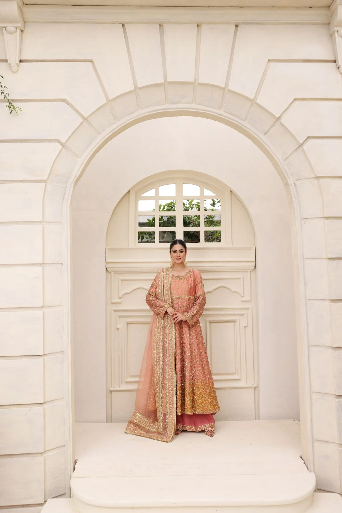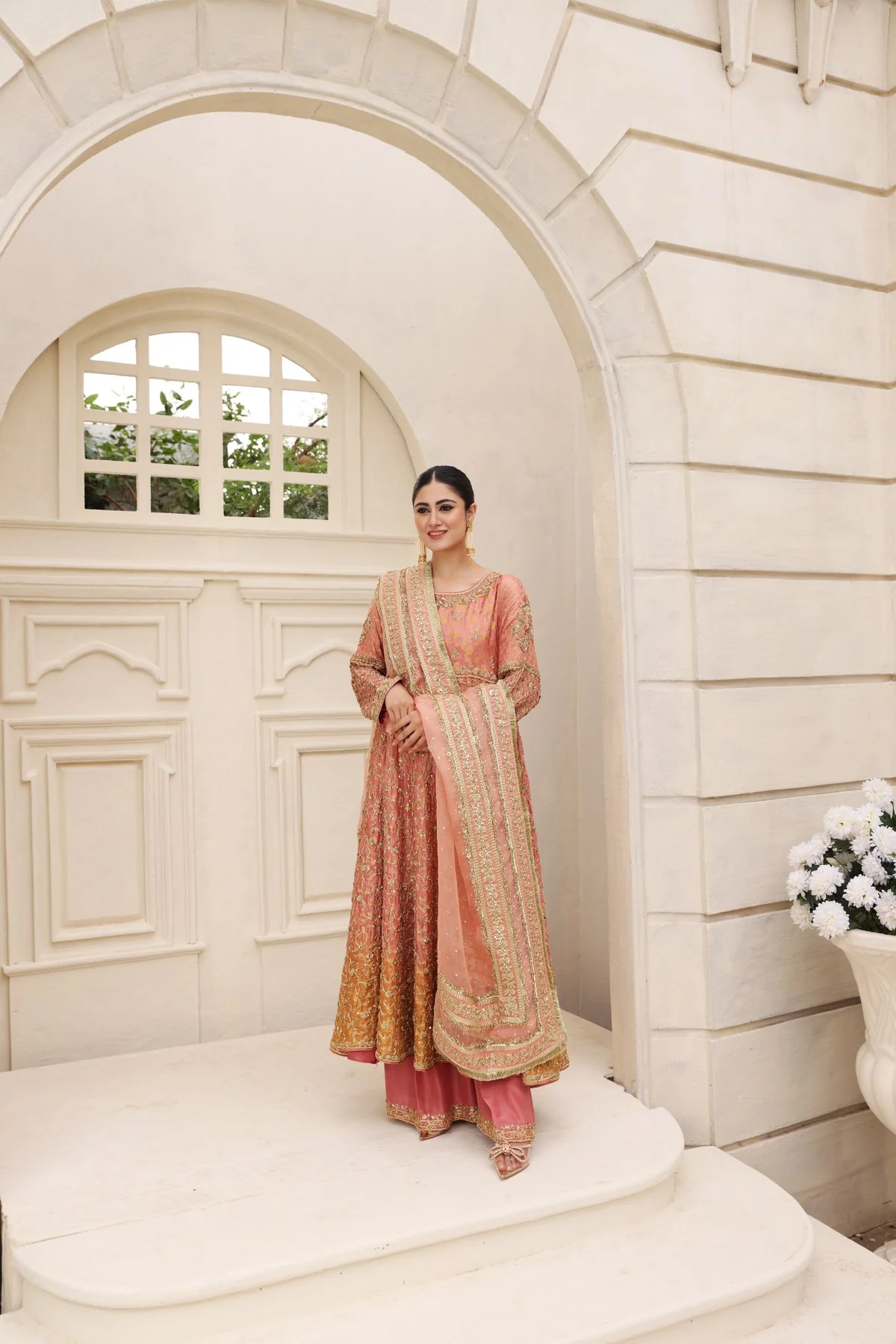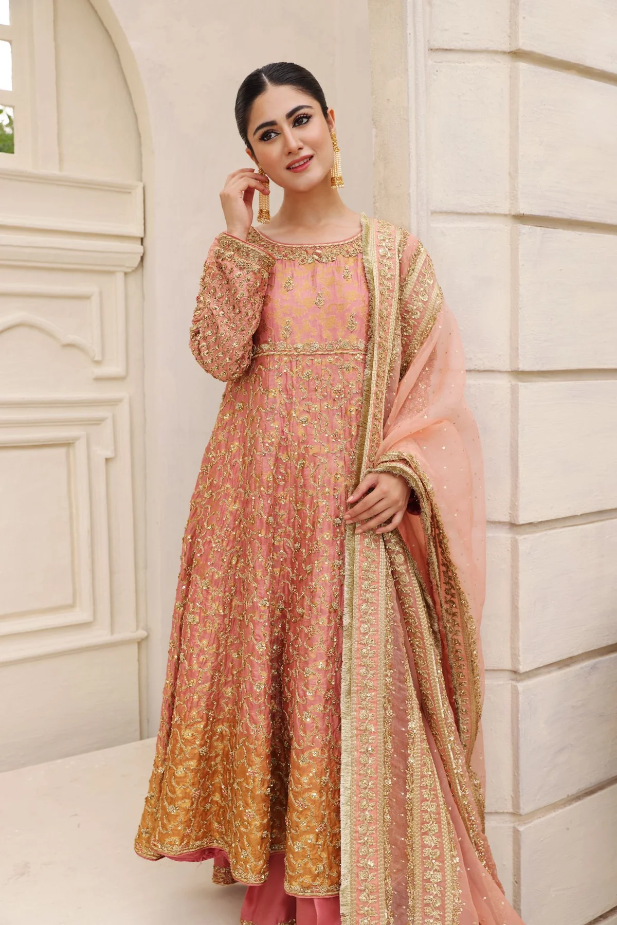 The kalidaar is crafted from woven banarsi brocade in enchanting tie dye coral tones, designed with added volume for a flattering and graceful silhouette. It is heavily embellished with intricate zardosi work featuring dabka, sequins, naqshi, and crystals, applied meticulously across the panels. The rich texture and detailed craftsmanship create depth while allowing fluid movement and elegance.