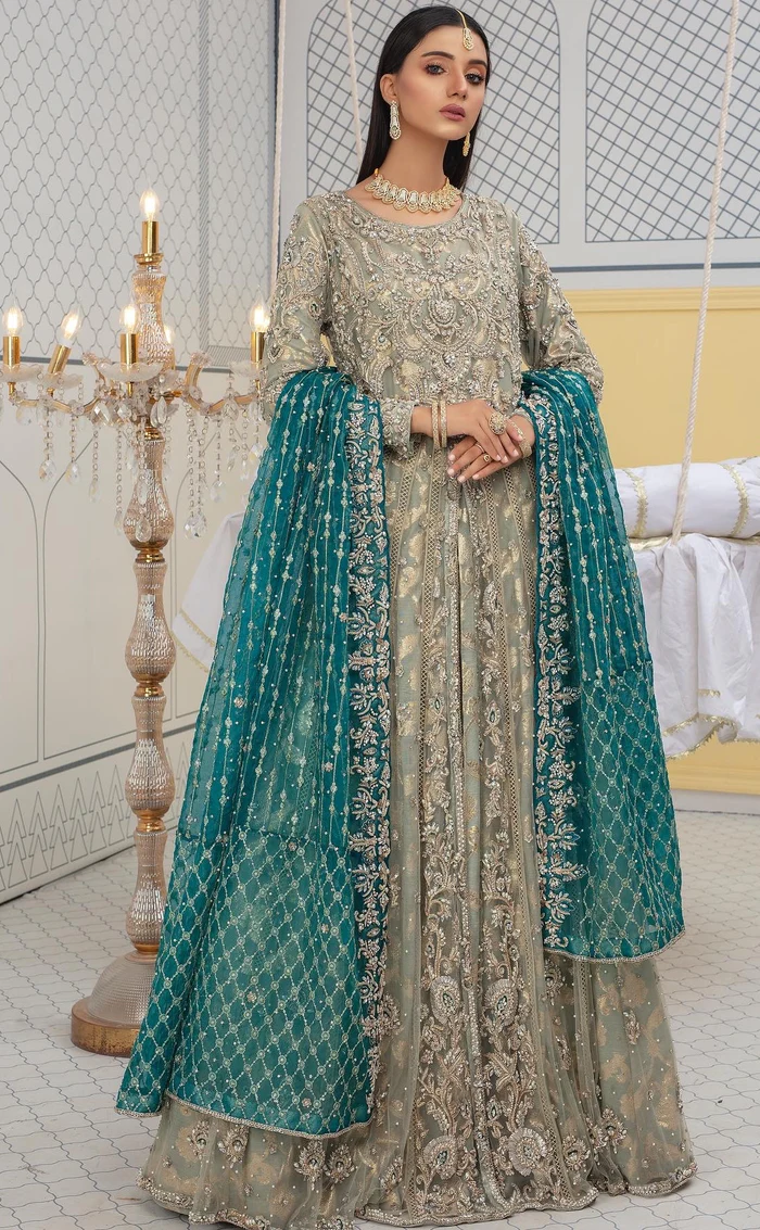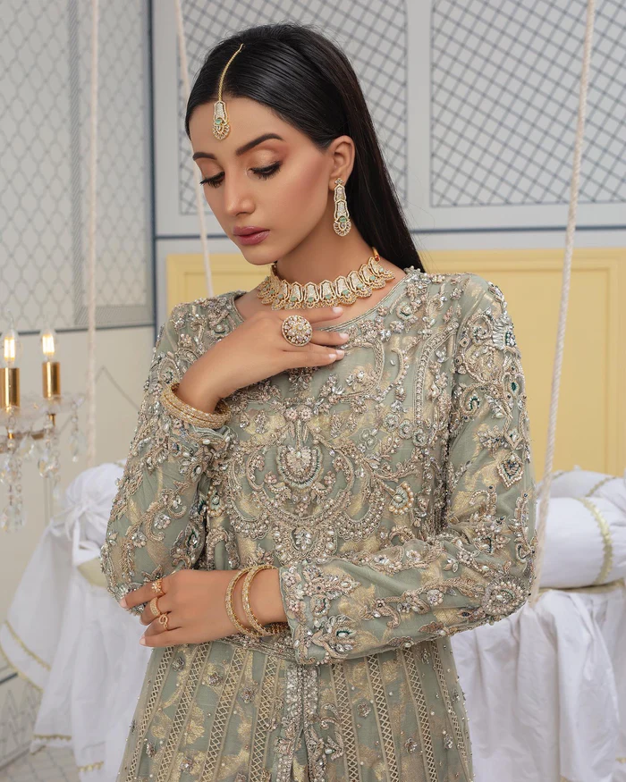 The dupatta is rendered in an elegant zinc-toned chiffon, bordered with intricate golden appliqué and detailed embellishment that harmonizes beautifully with the maxi. Sequins, beads, and delicately placed motifs add a soft shimmer throughout the fabric, while a katan-lined edge provides structure without compromising its airy, fluid fall.