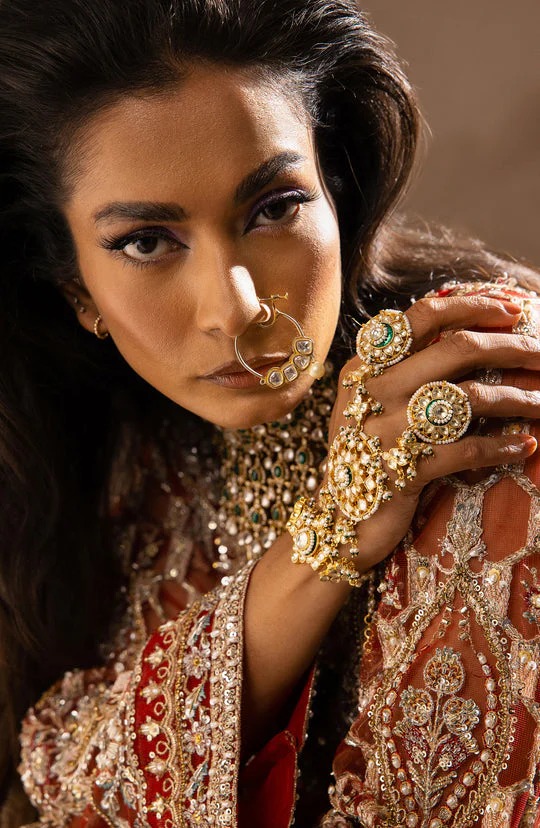 The kameez is crafted in a vibrant red shade from premium-quality fabric that ensures a graceful fall and structured elegance. Hand-applied detailing, including sequins, tilla, and beads, is arranged to enhance texture and create a captivating, glamorous look. The borders and sleeves are finished meticulously to offer a regal and traditional appearance perfect for weddings.