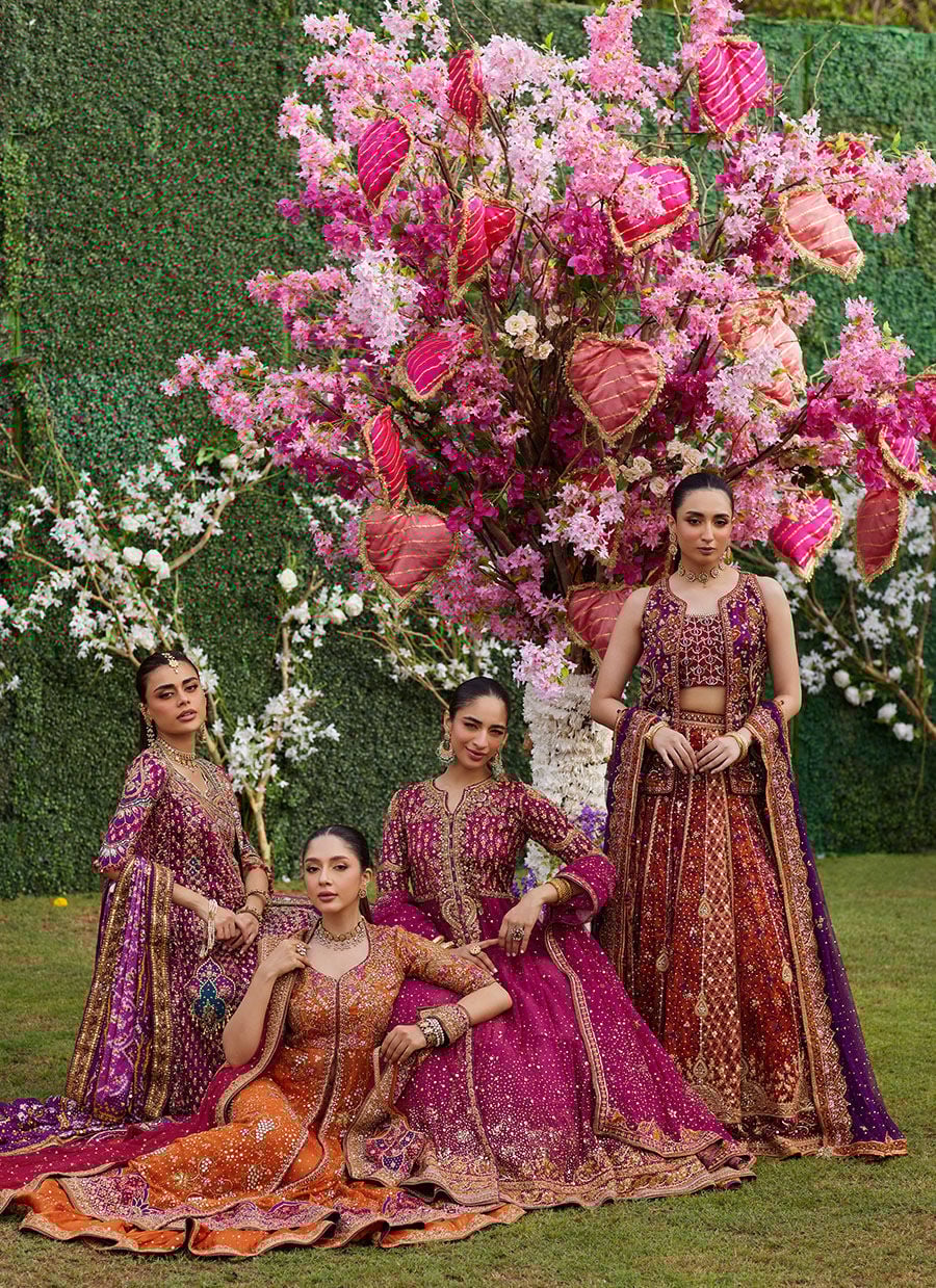 The ensemble is completed with a soft tulle dupatta that drapes effortlessly. Delicate hand detailing and a finely finished edge add subtle texture and visual interest, enhancing the outfit without overpowering its bold palette.