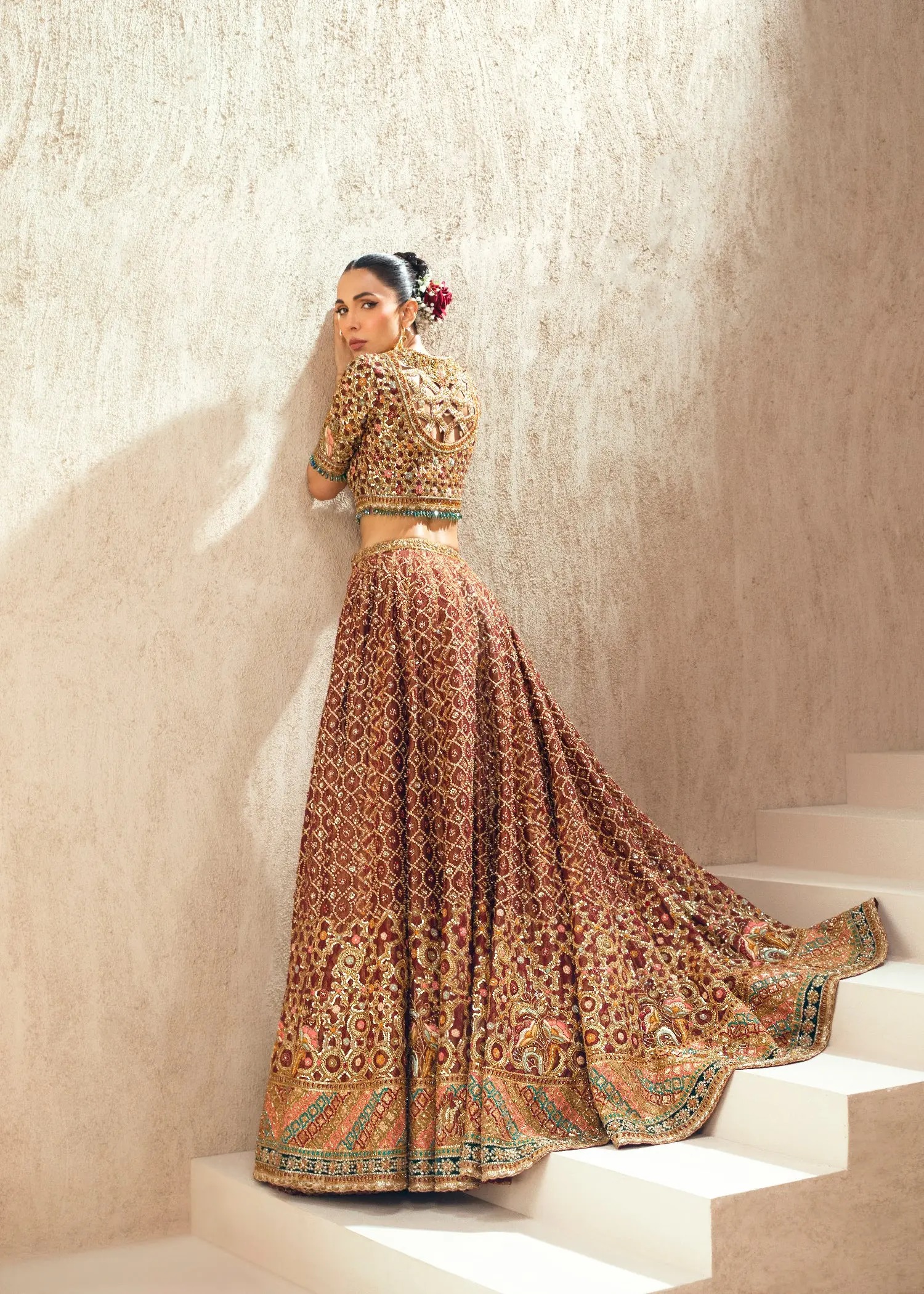 A timeless bridal masterpiece in deep maroon and crimson, featuring an intricately worked choli and a voluminous lehenga adorned with traditional gold zardozi, antique tilla, and artisanal floral motifs.