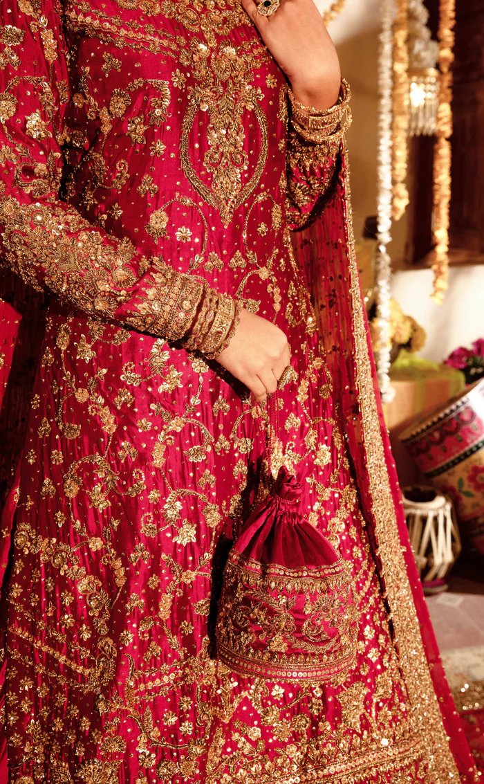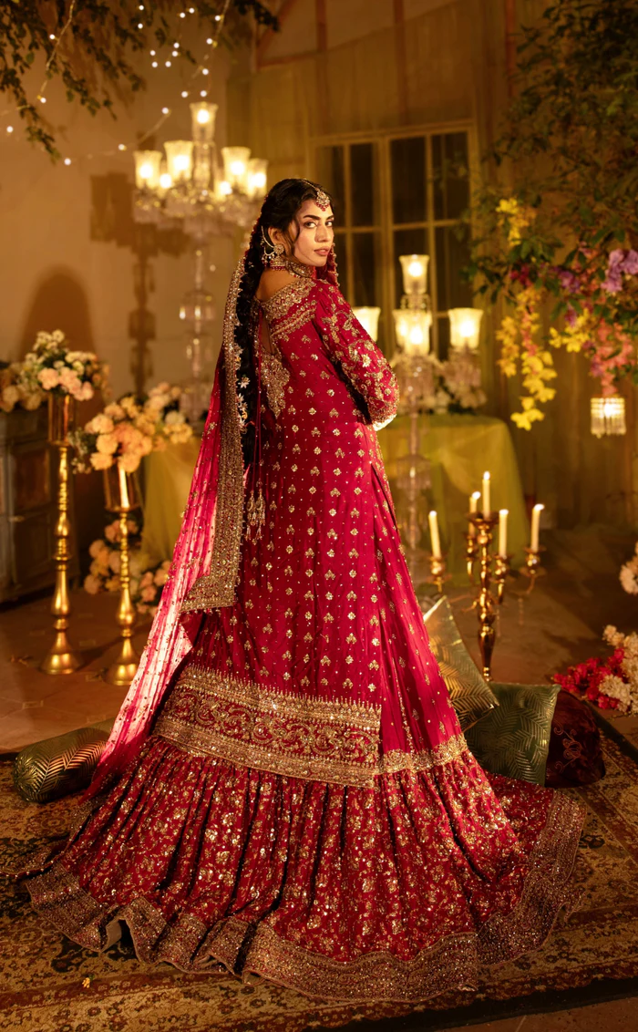 A breathtaking red bridal lehenga adorned with rich handcrafted embellishments, designed to radiate regal elegance and timeless bridal grandeur.