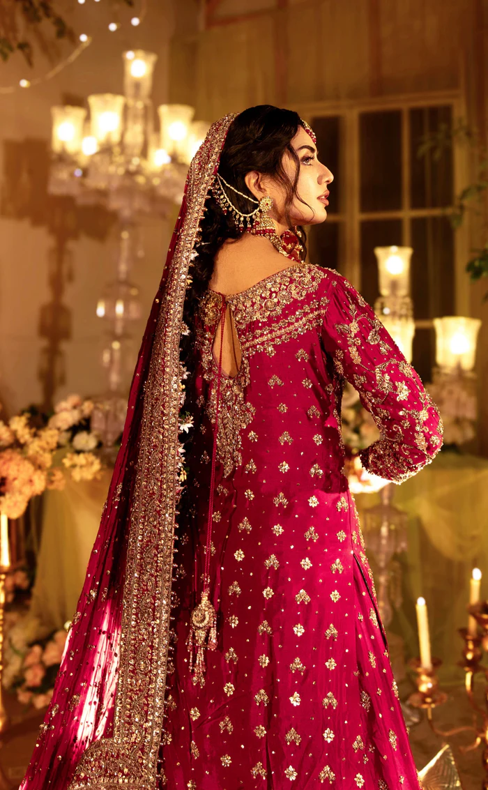 The fitted choli is tailored to perfection, crafted from luxurious, rich fabric that offers a structured yet graceful silhouette. Intricate handcrafted embroidery decorates the neckline, sleeves, and bodice, featuring traditional motifs inspired by florals and paisleys. The detailed workmanship, enhanced with sequins and shimmering accents, adds depth and brilliance, creating a refined bridal statement.