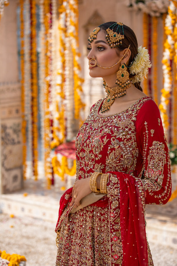 A deep red bridal lehenga set featuring refined motifs, delicate floral artistry, and a gracefully embellished long dress paired with an airy dupatta for timeless bridal elegance.